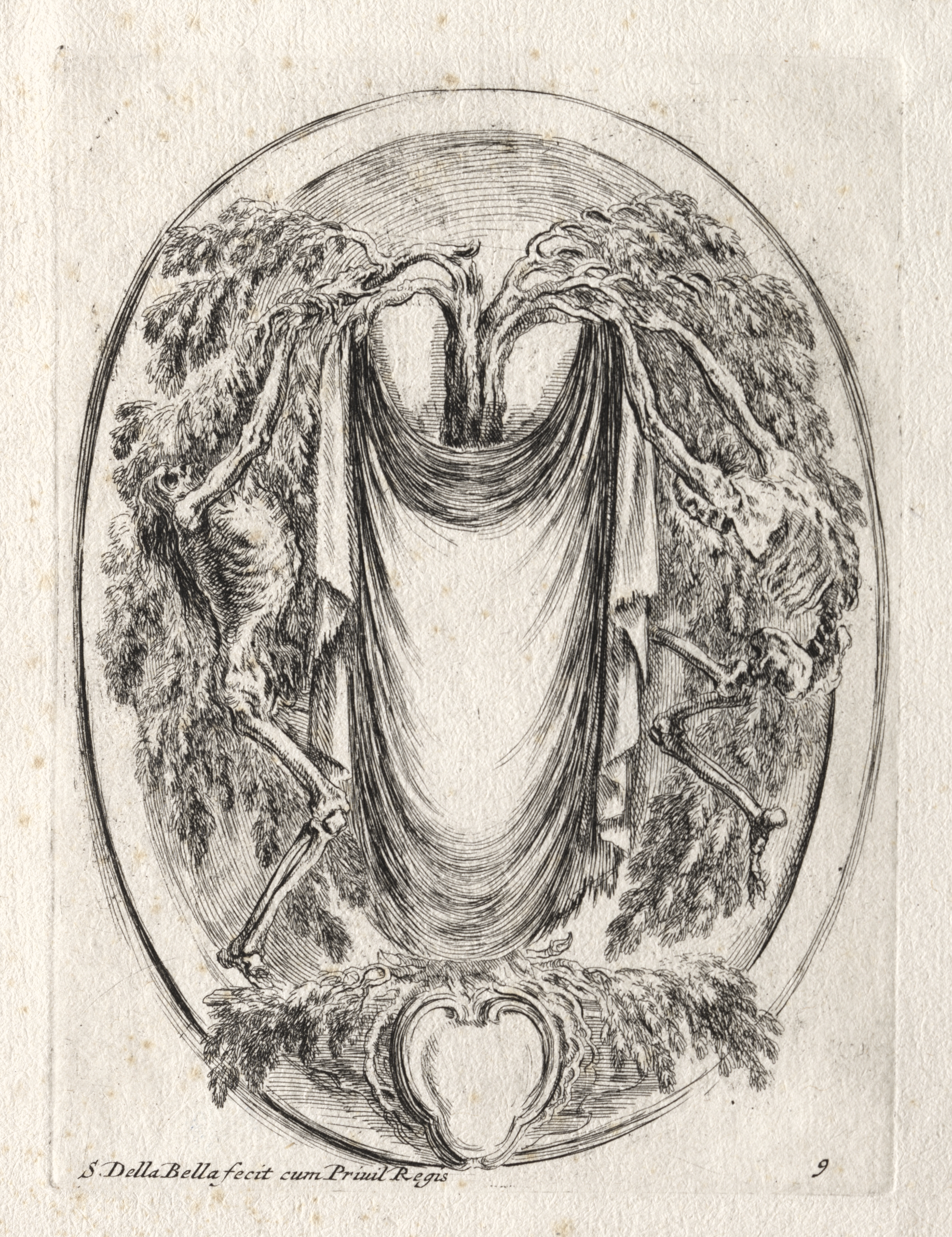 The image depicts a black and white drawing of an oval-shaped cartouche. The cartouche features a draped rectangle in the center. Two skeletal creatures with horns and furry bodies are on either side of the draped rectangle; their arms are raised, and their legs are bent. The skeletal creatures are holding the draped rectangle. The top of the rectangle has a shape resembling a four-leaf clover. The background of the oval features foliage. The oval is outlined with a thin line. The image is signed "S. Della Bella fecit cum Privileg Regis" at the bottom left. The number "9" is at the bottom right. The background of the image is off-white.