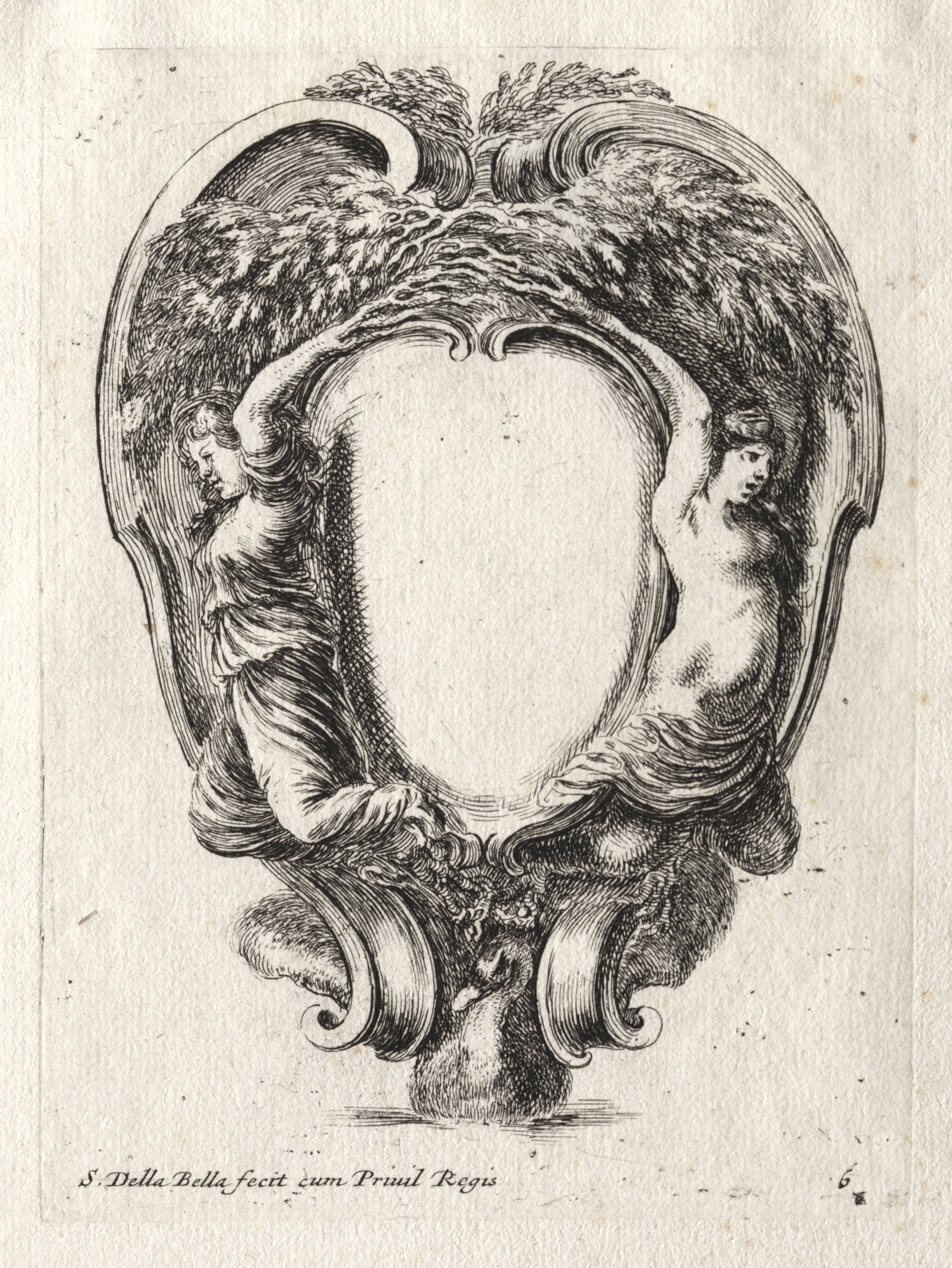 An oval-shaped frame with a blank center. Two nude figures, one on each side, are depicted leaning inwards, their arms curving upwards and outwards. The frame has an ornate design with a leafy pattern at the top. The figures have curly hair and are wearing draped cloth. The frame has scroll-like designs at the bottom and appears to be drawn in black and white. The background of the image is off-white. Small text at the bottom reads "S. Bella Bella fecit cum Privileg Regis".