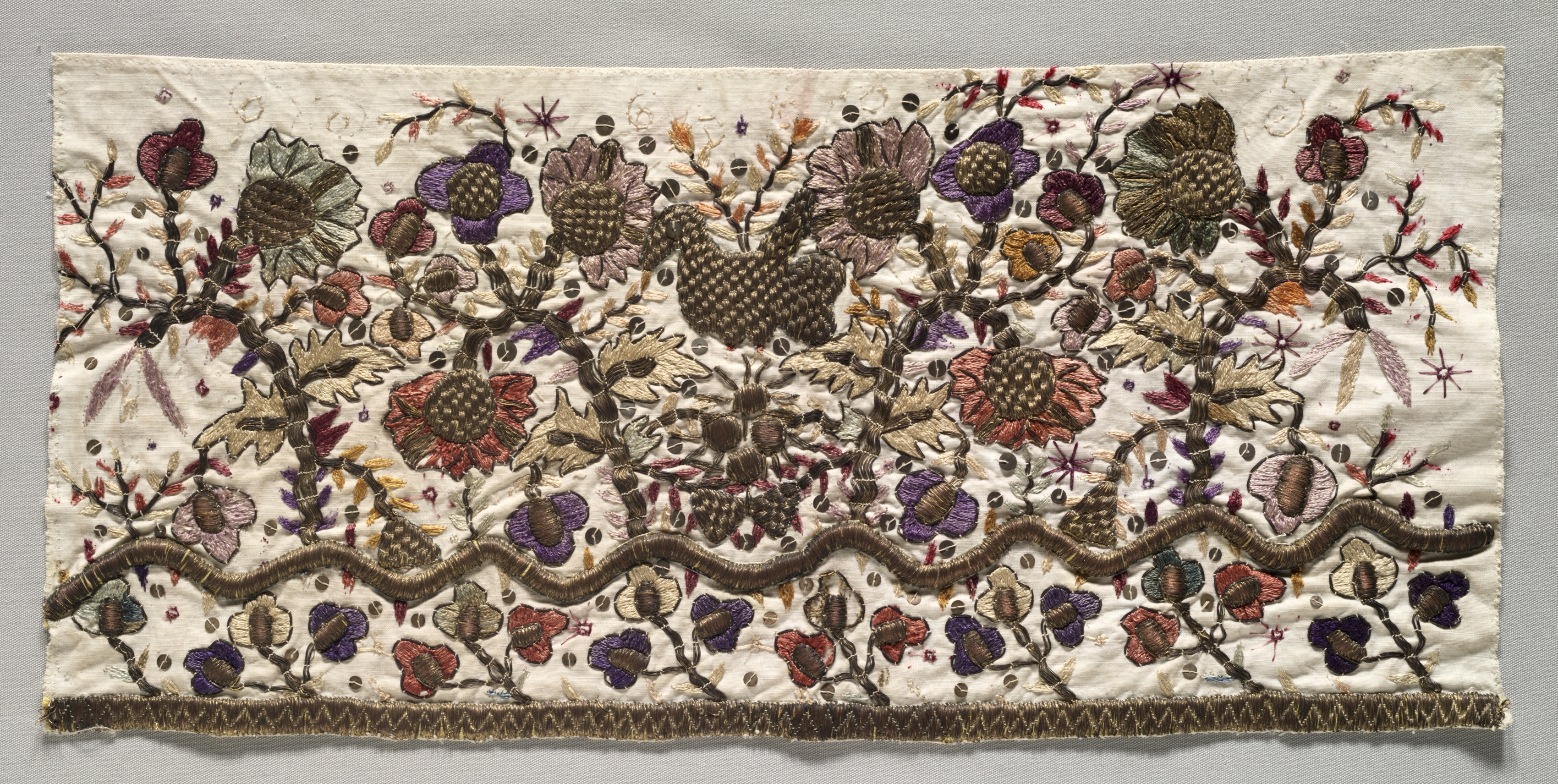 Embroidered Fragment by artist unknown. White rectangular piece of fabric with embroidered flowers and leaves in shades of purple, pink, red, and brown. The fabric has a wavy brown line embroidered near the bottom edge. A brown fringe trim is along the bottom edge. The background of the fabric is wrinkled and off-white. The fabric is rectangular with straight edges. The embroidered design fills most of the fabric, leaving a small border around the edges. The image is a close-up shot of the fabric. The background behind the fabric is a light gray color.