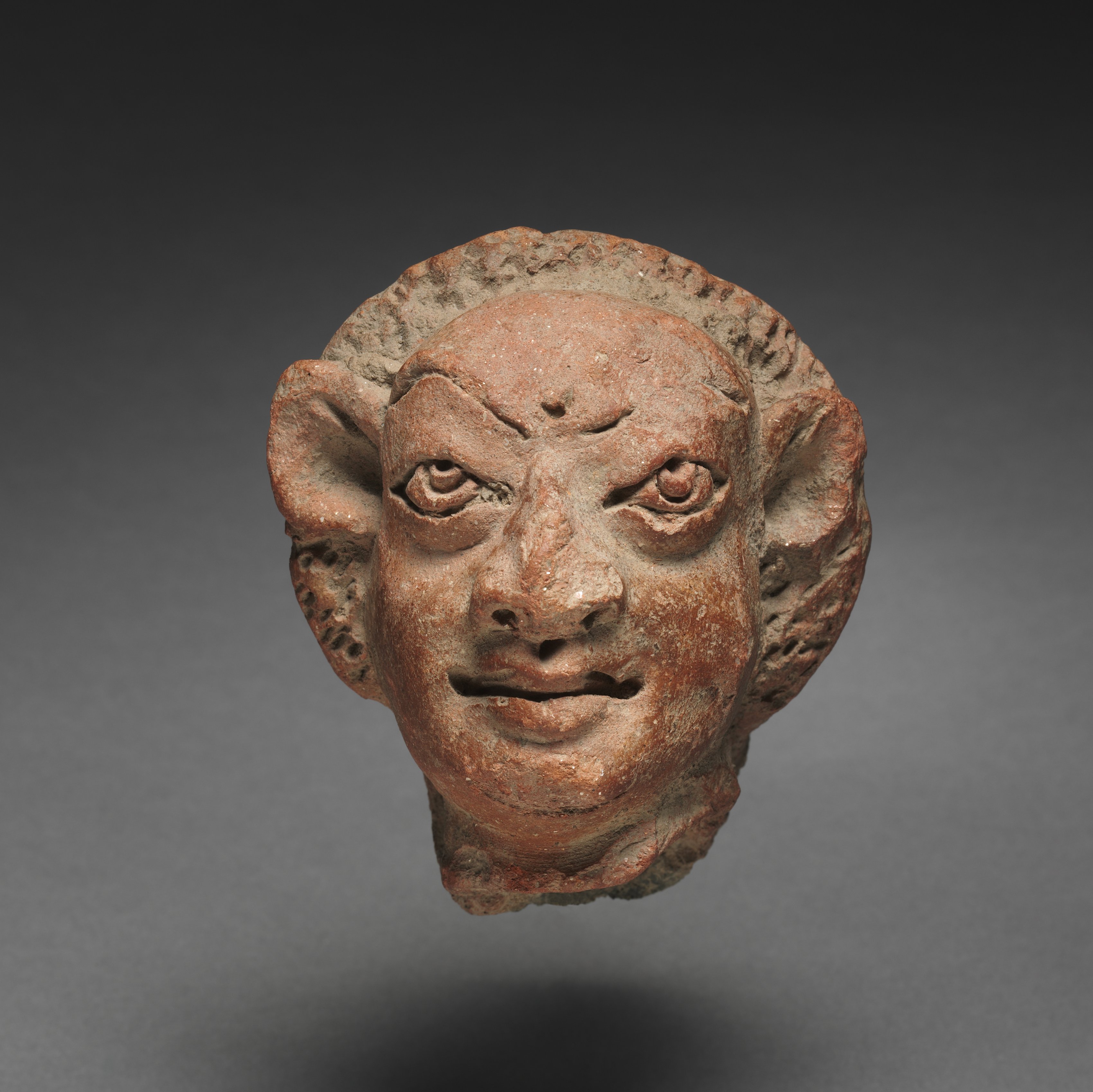 The image depicts a sculpture titled "Grotesque Male Head" by an unknown artist. The sculpture is a reddish-brown, stone or clay head of a male figure with a grotesque appearance. The head is viewed from the front, angled slightly toward the right. The figure has a large nose, ears that protrude outward, and sunken eyes. The eyebrows are furrowed, and the mouth is slightly open. The hair is depicted as short and curly, with a decorative border around the forehead. The background of the image is a gradient of dark gray to light gray, with a shadow cast by the sculpture.