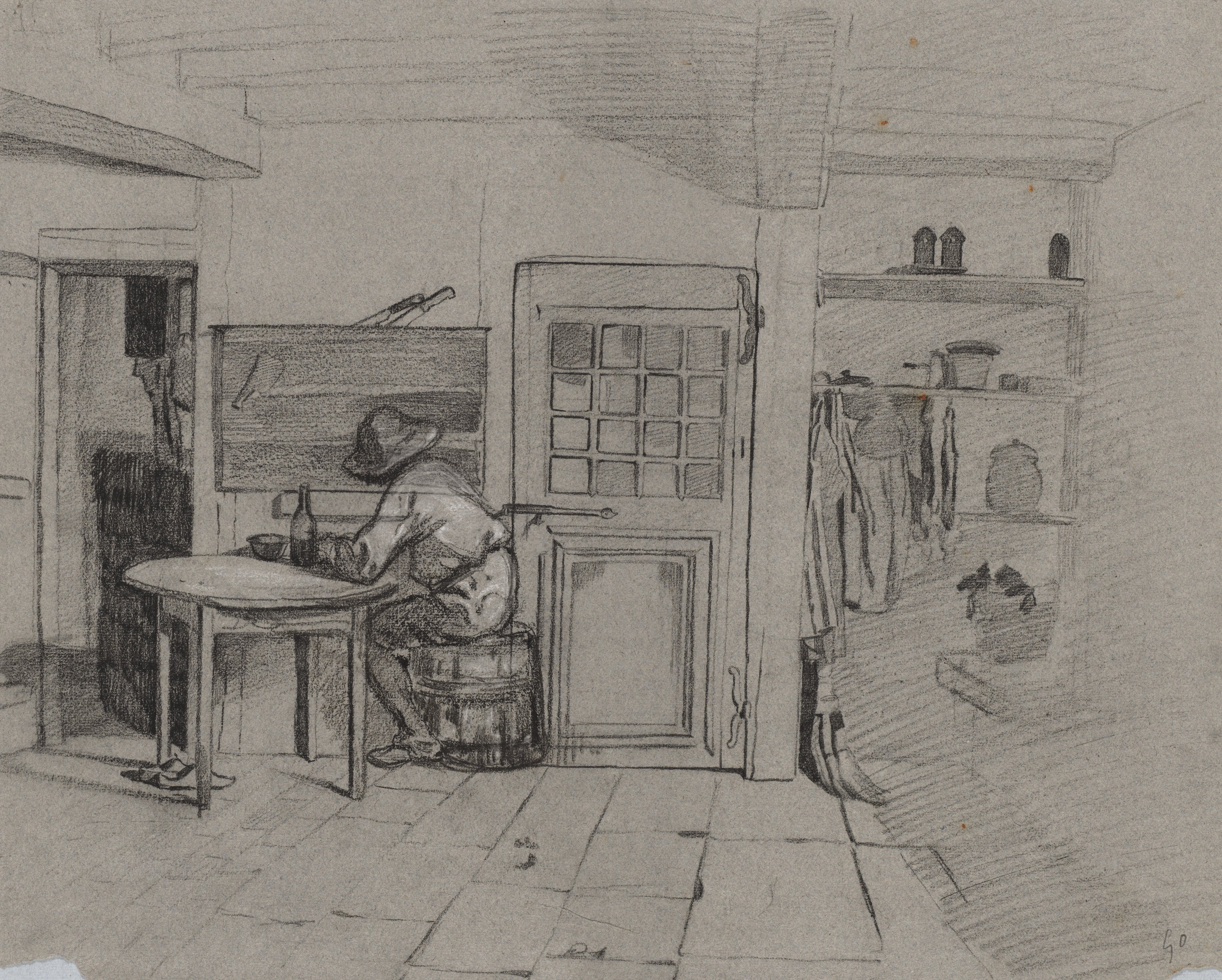 The image depicts a black and white pencil drawing of a young boy sitting at a table in a farmhouse interior. The boy has short hair and wears a light-colored shirt; he sits on a wooden bucket on the left side of the image. To his right is a small round table with a bottle and a bowl on top. The room has a tiled floor and white walls. To the left of the boy is an open door leading to another room. On the right side of the image is a built-in shelf with various items on top and hanging from it. In the background, a door with a grid-patterned window is visible. The overall atmosphere suggests a simple and rustic setting.