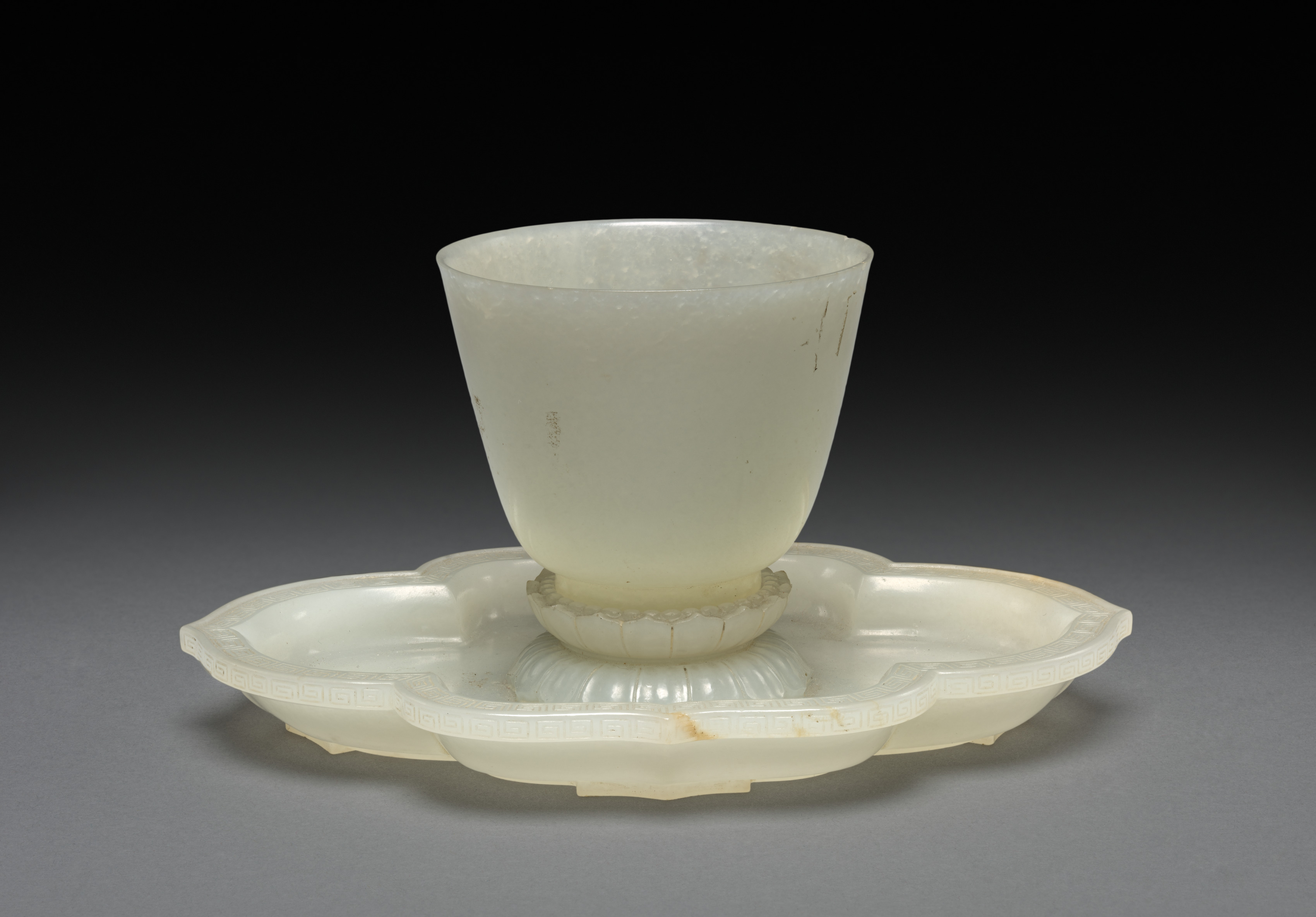 The image shows a white jade lotus-shaped dish and cup. The cup is positioned centrally on top of the dish. The cup is made of white jade and has a wide mouth and a narrow base. The body of the cup is slightly tapered. The cup appears to have some scratches. The dish is also made of white jade and has a lotus flower shape with multiple rounded petals. The edges of the dish are carved with a pattern. The dish has a flat base with a decorative edge. The background of the image is black, fading to gray at the bottom.