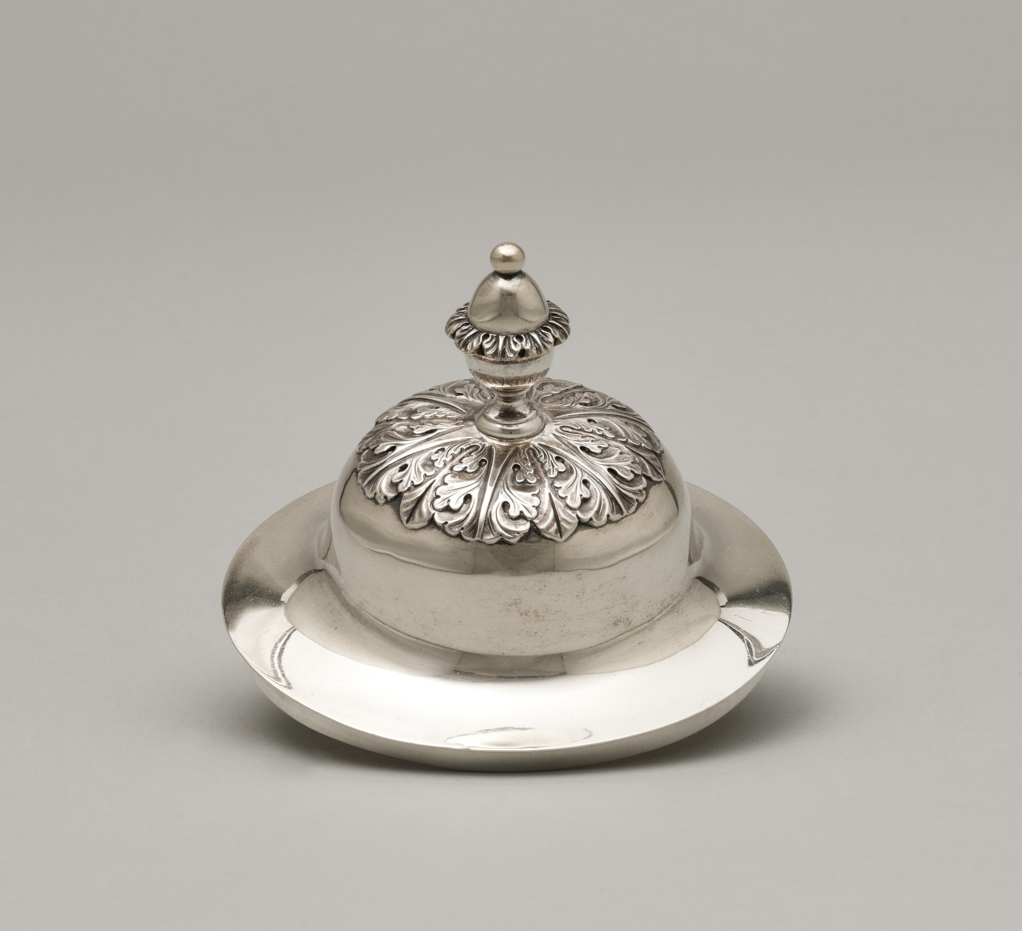Tea Urn with Cover by Harvey Lewis: Silver-colored metal object, round base that is wider at the bottom than the top, the base has a handle on either side; the lid on top has a finial and a design of raised floral patterns; the lid sits on a wider base.