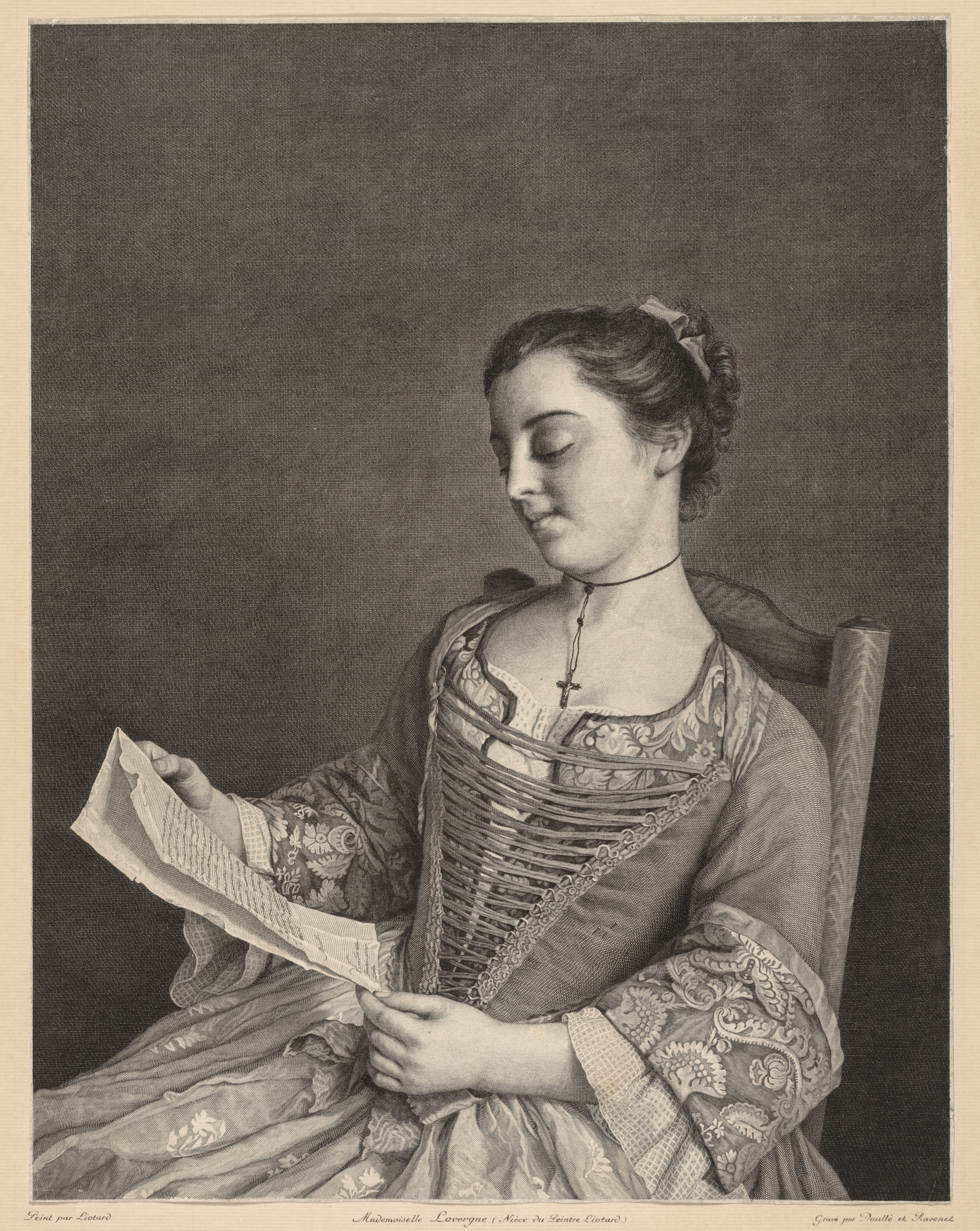 Black and white portrait of a woman sitting in a chair. The woman has dark hair tied back with a ribbon. She wears a dress with a corseted bodice and a floral patterned skirt and sleeves. A cross hangs on a cord around her neck. She holds a folded paper in both hands and looks down at it. The background is dark gray. A thin light-colored border surrounds the image with writing at the bottom.