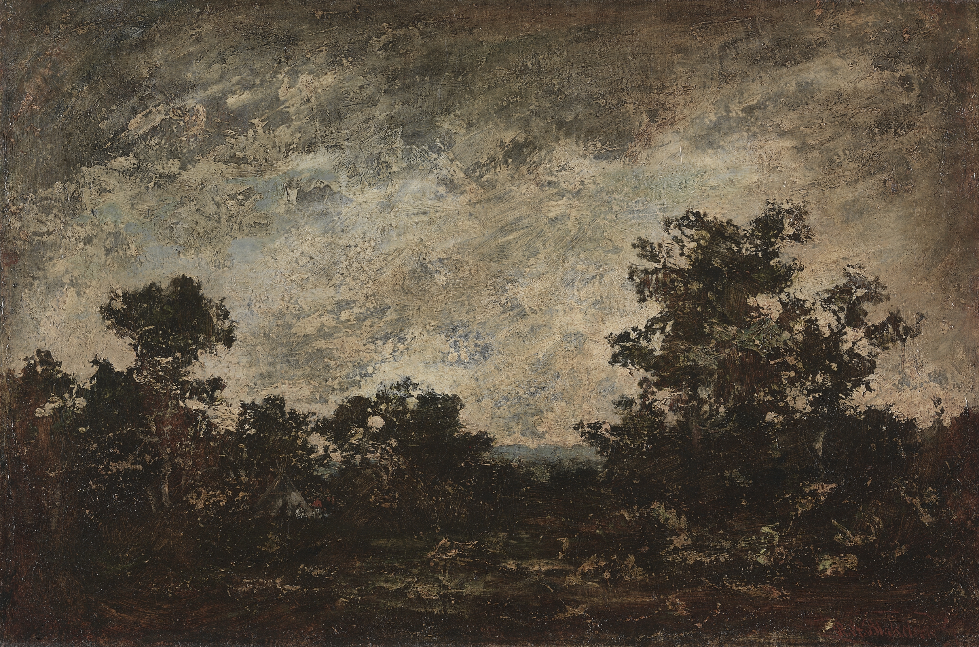 Dark brown and black trees line the bottom of the painting. A small house is on the left between the trees. A dark body of water is at the base of the trees. The cloudy sky takes up most of the painting and is colored shades of gray, white, and blue. The painting is titled "Indian Camp" and was created by Ralph A. Blakelock.