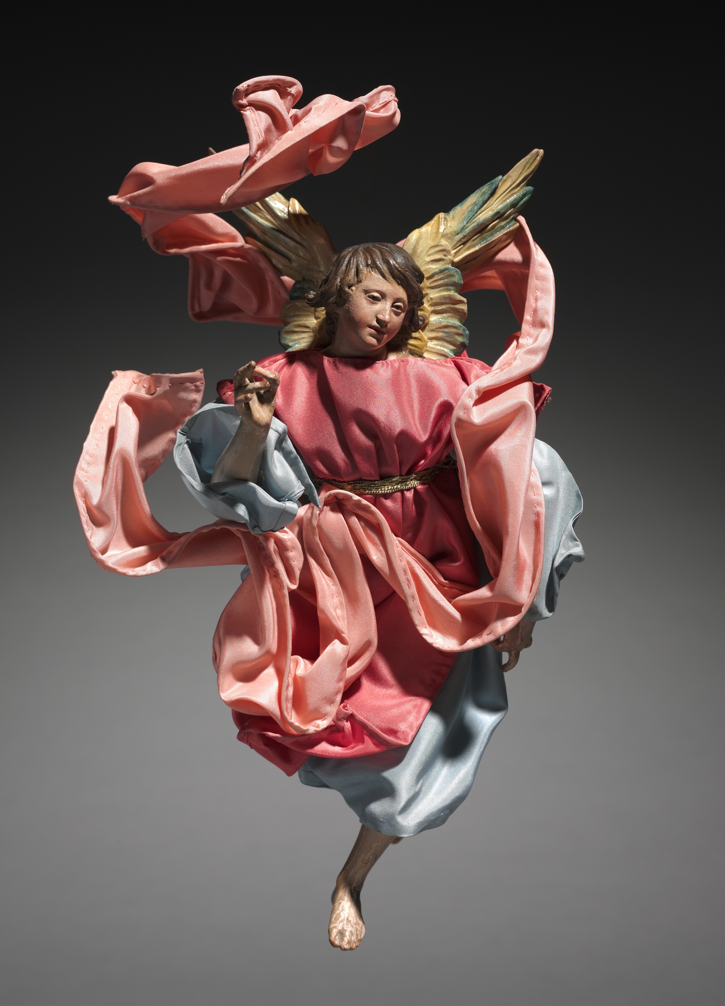 The figure depicts an angel with dark hair and a neutral expression. The angel wears a pink robe with a gold belt around the waist and a blue garment underneath. The robe has long, flowing sleeves and a pink cloth flowing from the back. The angel has large gold and green wings protruding from their back. One leg is bent at the knee, while the other is extended downwards. The background is dark at the top and lightens towards the bottom. The overall appearance suggests a religious or artistic representation.