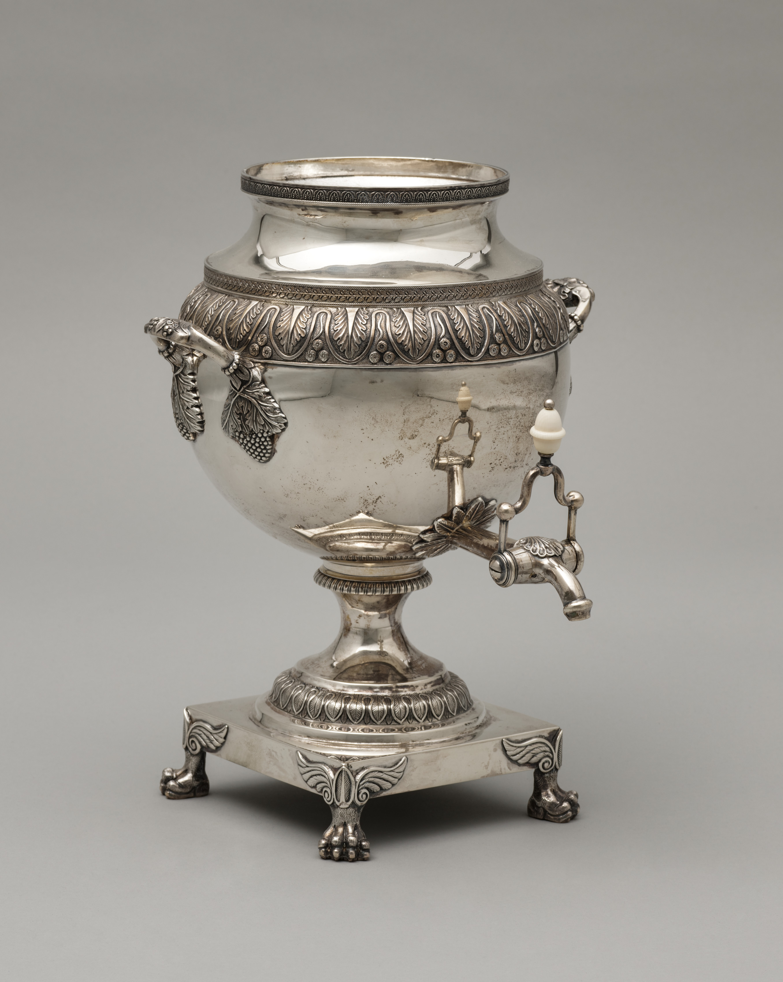 Tea Urn by Harvey Lewis: The urn has a rounded body with a narrow, short neck and a wide mouth. A decorative border of leaves and dots encircles the top. Two handles are on either side; one is a spout with an off-white material at its end and the other is ornamental and made to look like a bunch of grapes with leaves. The urn sits on a matching base with four claw feet. The entire piece is made of silver-colored metal and has a second decorative border around the bottom of the body and around the base. The feet have a paw-like design. The background is gray.