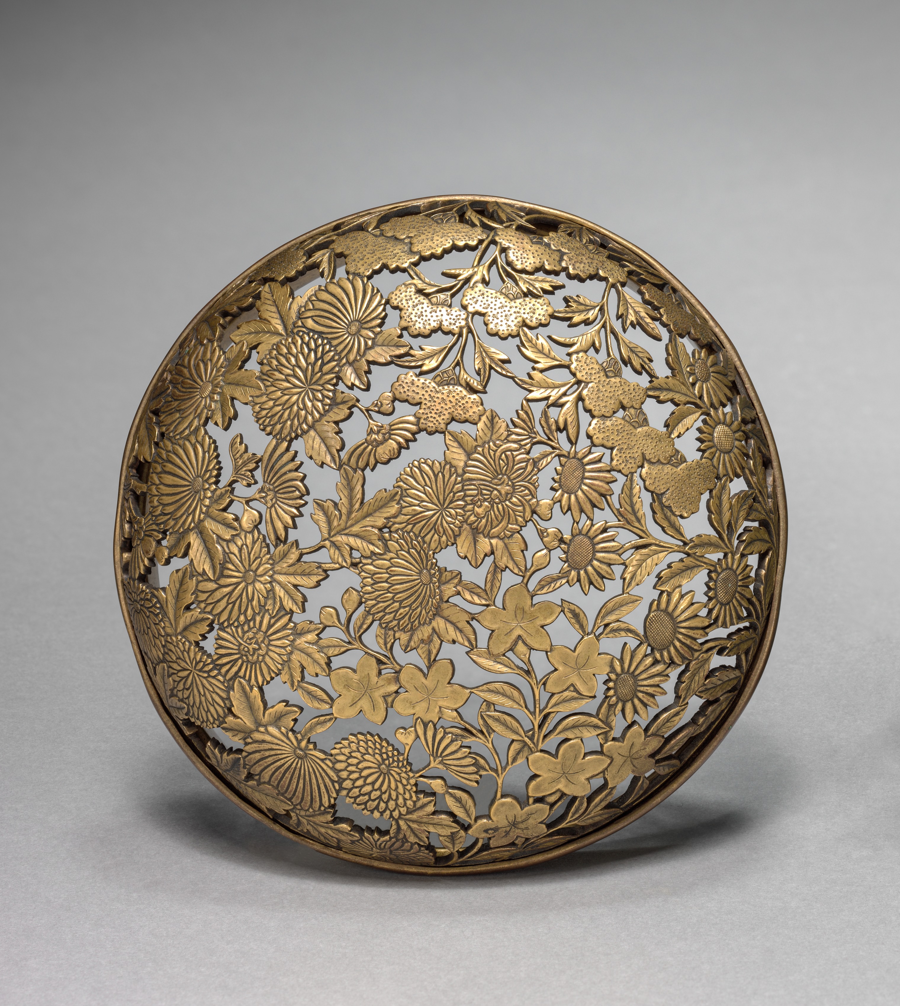 Gold-colored, round incense burner with intricate floral design, featuring various flowers and leaves cut out of the metal.