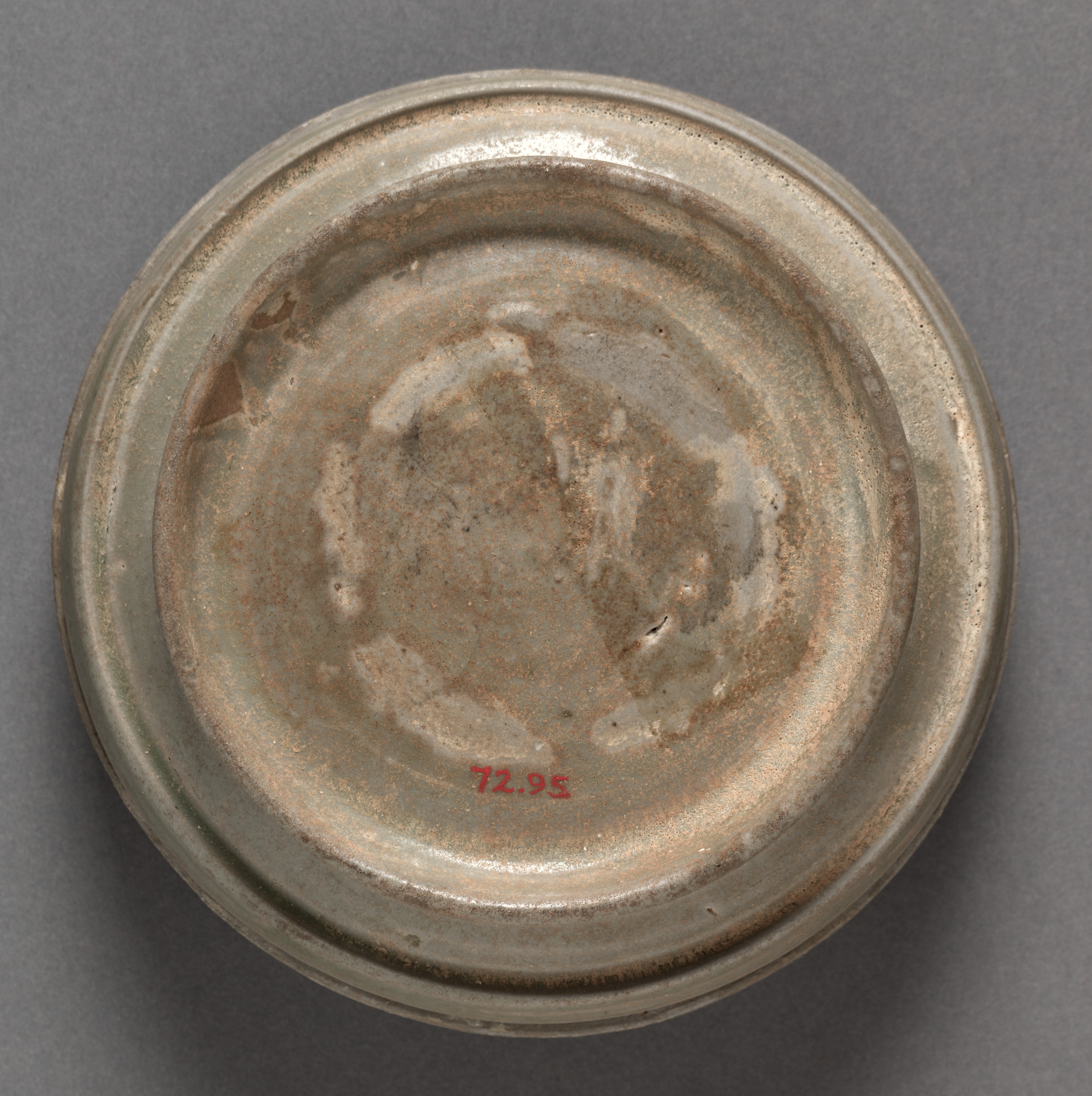 Covered Box: Yue Ware. Gray ceramic object with a circular shape. The object has a wide mouth and a recessed area within. The exterior and interior surfaces appear to have a glazed finish. The glaze on the interior displays shades of gray, brown, and hints of green. The exterior has similar coloring with more visible brown tones. The base of the interior shows a red marking: "72.95". The object sits on a gray background.