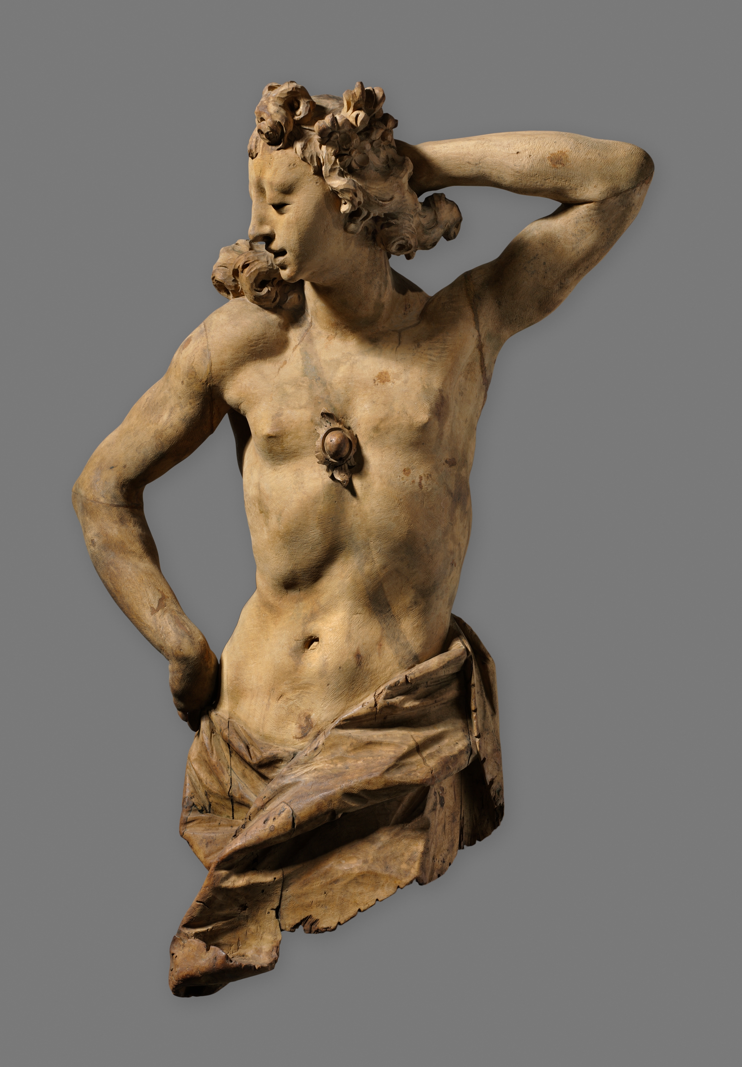 A sculpture depicting a male figure with curly hair, created by Ignaz Günther, showing a nude male with his left hand on his hip and his right hand raised to his head, wearing a cloth wrapped around his waist, against a gray background. The figure has a defined torso and navel.