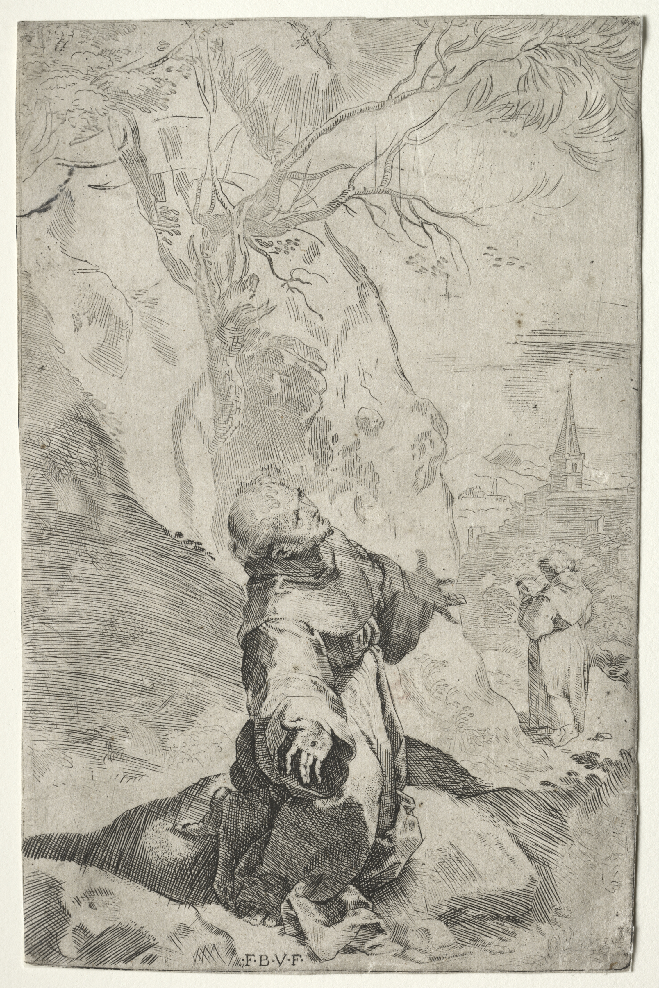 Black and white drawing of a kneeling man with hands outstretched. The man wears a long-sleeved tunic with a hood. He has a tonsured head and appears to have blood on his hands. A tree trunk is behind him on the left. A smaller figure stands on the right. A building with a steeple is in the background. The drawing is signed "FBVF" at the bottom. The entire scene is in grayscale. The drawing depicts St. Francis Receiving the Stigmata by Federico Barocci.