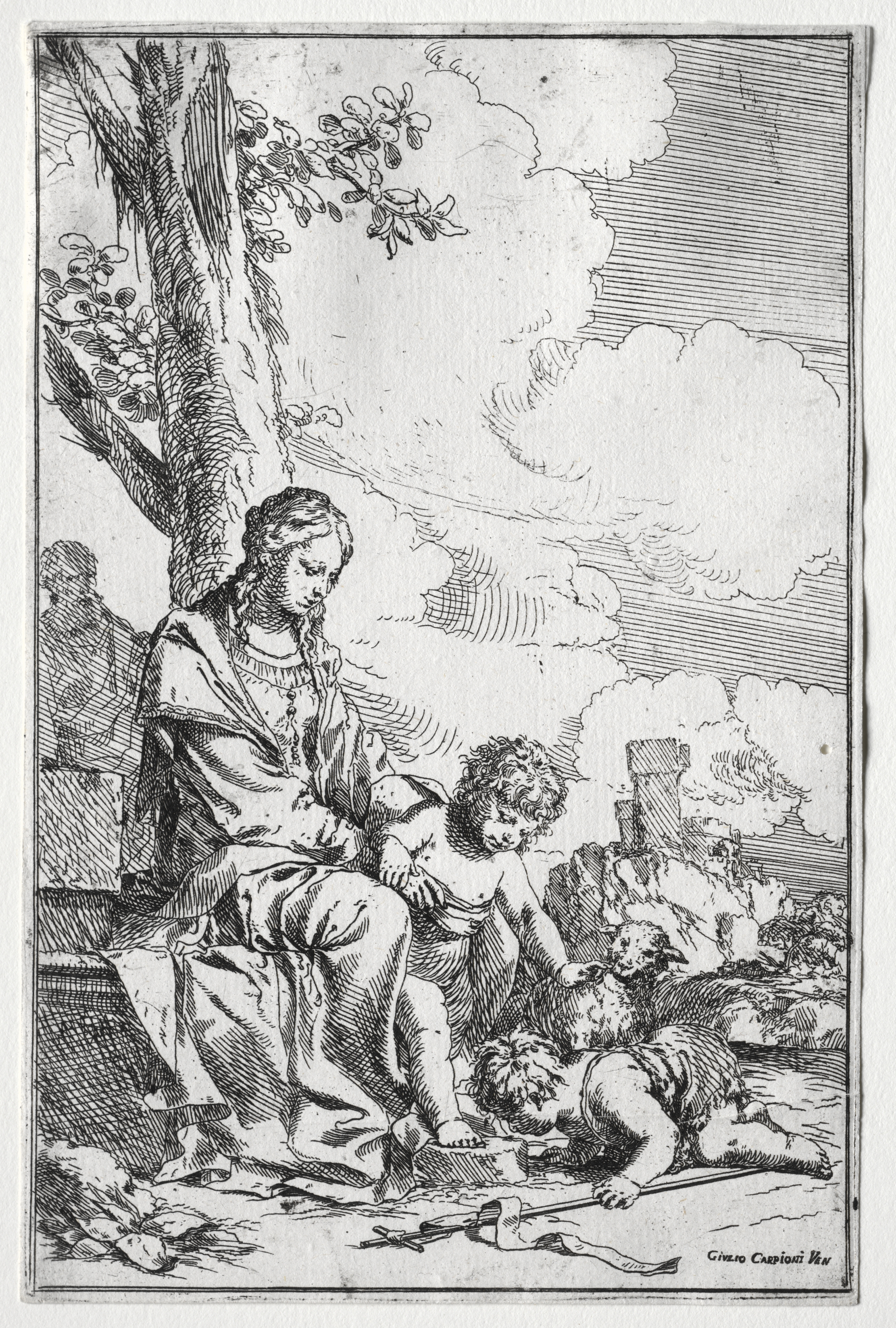 The image depicts a black-and-white drawing of a scene with a woman sitting on a rocky outcropping, surrounded by two young boys. The woman has long hair and wears a dress and shawl, sitting with her right hand on the lap of a small child standing before her. The child has curly hair and is nude. A younger child crawls on the ground to the right, holding a stick. The woman and children are positioned to the left of the image, with a tree trunk behind them and a landscape with buildings and clouds in the background. The drawing is signed in the bottom-right corner.