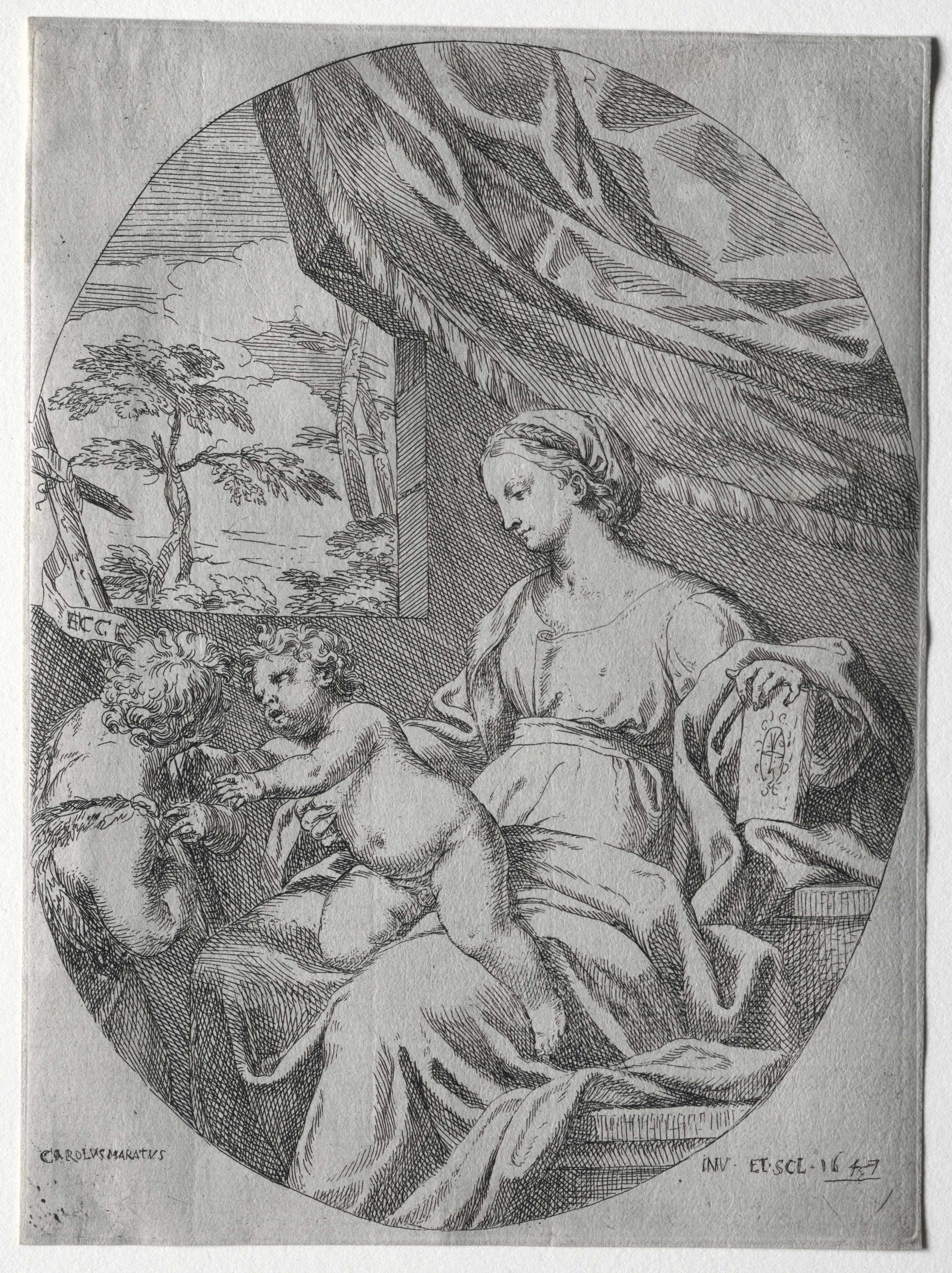 The image depicts a black and white drawing of a woman and two children in a landscape. The woman sits on the right side, wearing a long dress with a head covering. Her hair is partially visible. She looks to her left at a child who sits to her left. The child wears only a diaper and holds an object up to another child's mouth. This second child sits on the left, viewed from the back, wearing only a diaper and a cloth wrapped around his waist. The background shows trees, bushes, and a body of water. A curtain or drapery hangs above the figures. The entire scene is encircled by a large oval line. The artist's name is written in the bottom-left corner.