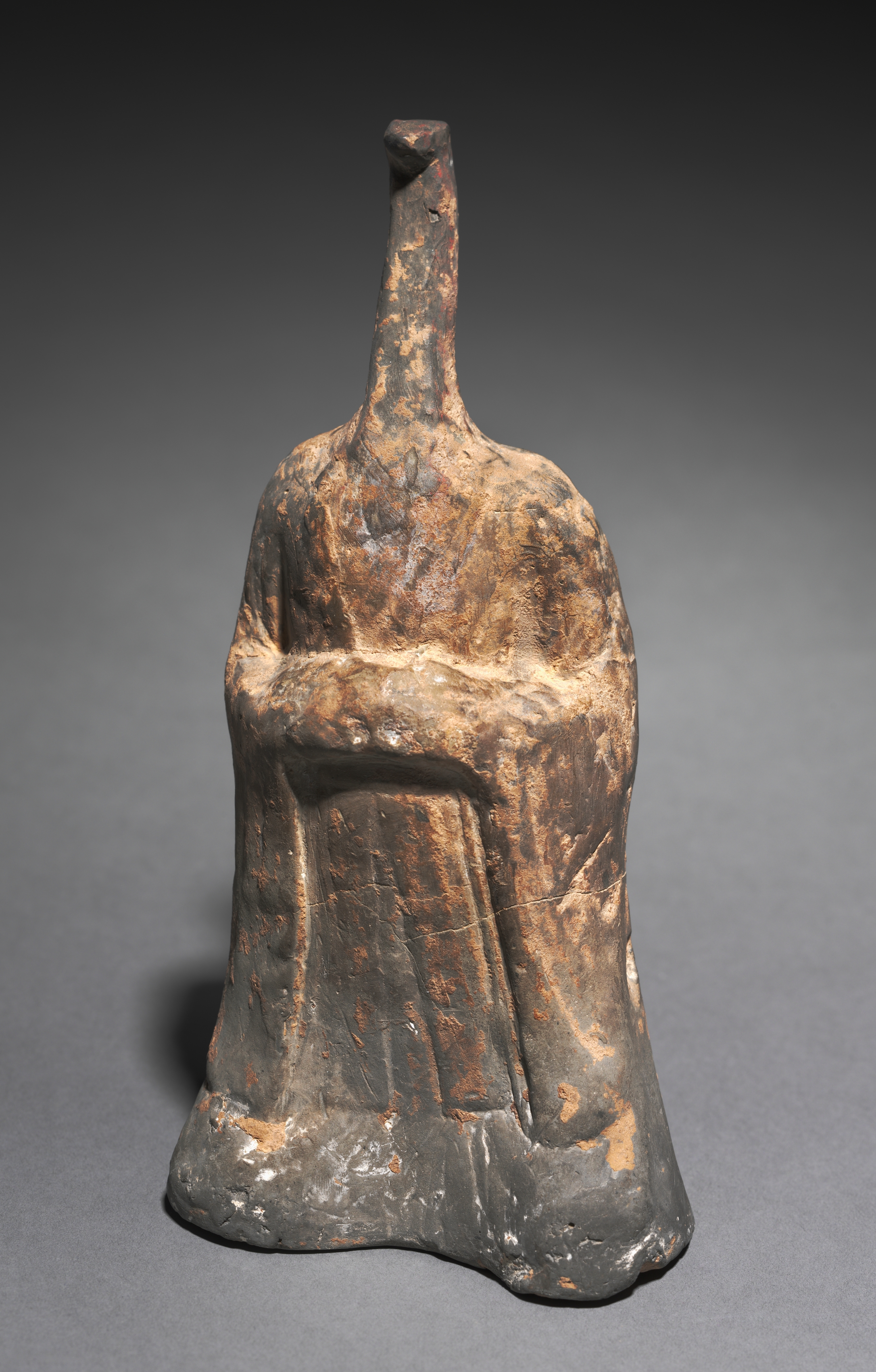 The artwork titled "Mortuary Figure of the Zodiac Sign: Serpent (Virgo)" by an unknown artist depicts a weathered, dark-colored figurine with a predominantly brown and black patina. The figure is seated cross-legged with its arms resting on its knees. A long, thin protrusion extends upwards from the top of the figure's head. The surface of the figurine shows signs of aging, with visible cracks and wear. The figure wears a long robe that drapes down to its base, which is irregularly shaped. The background of the image is a gradient that transitions from dark at the top to light gray at the bottom.
