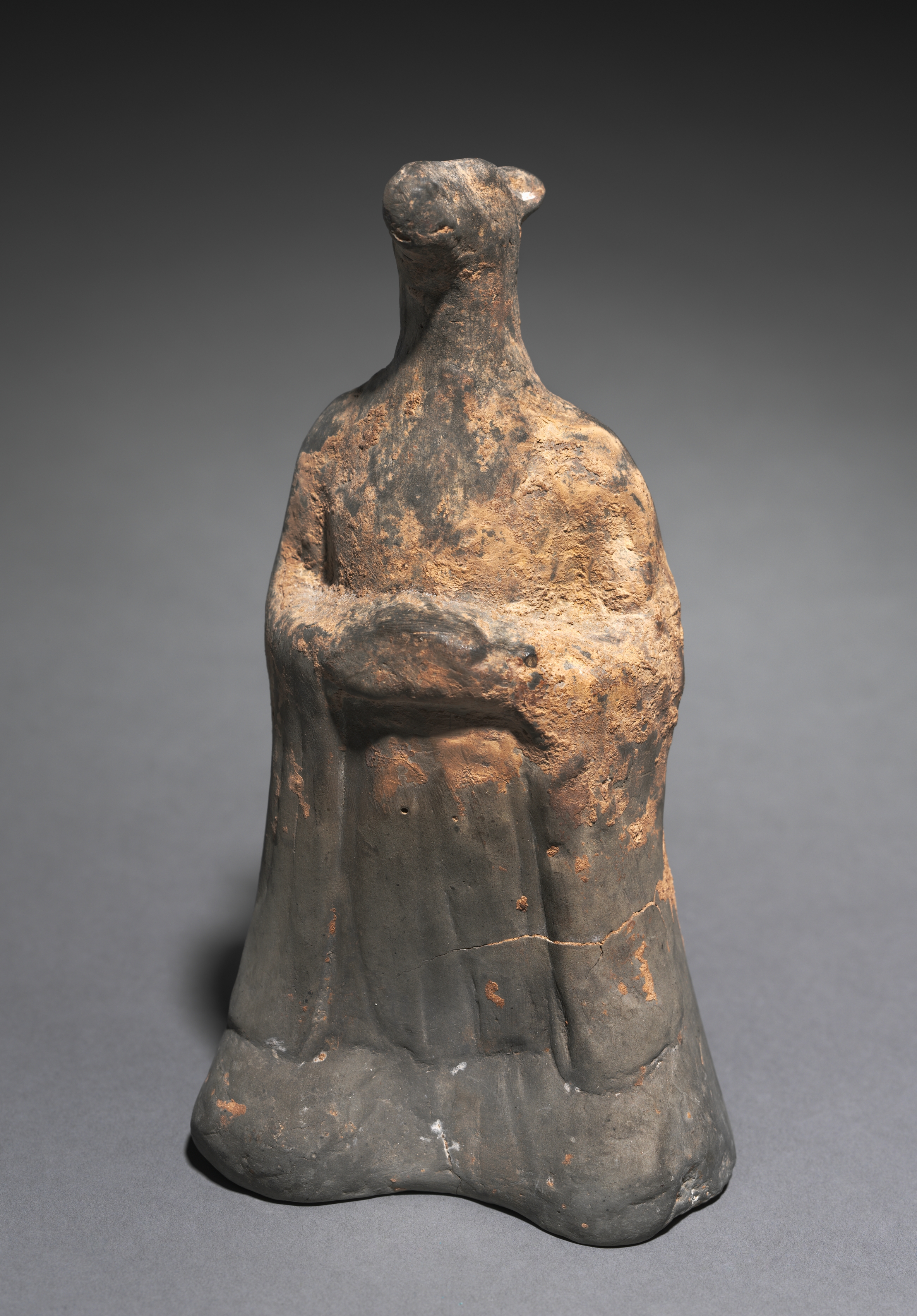 The object is a small, weathered terracotta or clay figurine. The figurine is dark grey and brown in color. It represents a standing figure with a smooth head and no defined facial features. The body is covered by a long, flowing robe that drapes down to the base of the figurine. The arms are folded across the chest. The base of the figurine is wide and rounded. The background of the image is a gradient from dark grey at the top to light grey at the bottom.