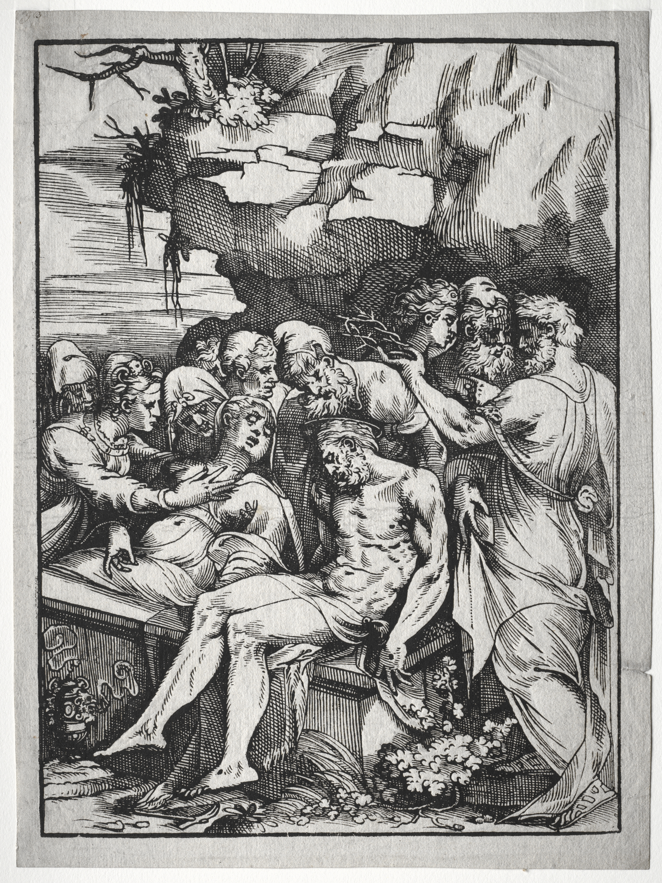 The Entombment by Andrea Schiavone. Black and white drawing of a group of people gathered around a central figure. The central figure is a shirtless man with curly hair who is being lowered into a tomb. He is surrounded by a group of approximately 10 other men and women. Some of the figures are dressed in robes, while others wear shirts and head coverings. In the background, there is a rocky cliff with a tree and a few flowers. The drawing features a range of shading and texture, with some areas being more detailed than others. The image is framed by a thin black border, and it appears to be printed on a piece of paper with a light gray background. The scene depicts a somber and mournful atmosphere. The overall style of the drawing suggests it was created in the Renaissance period.