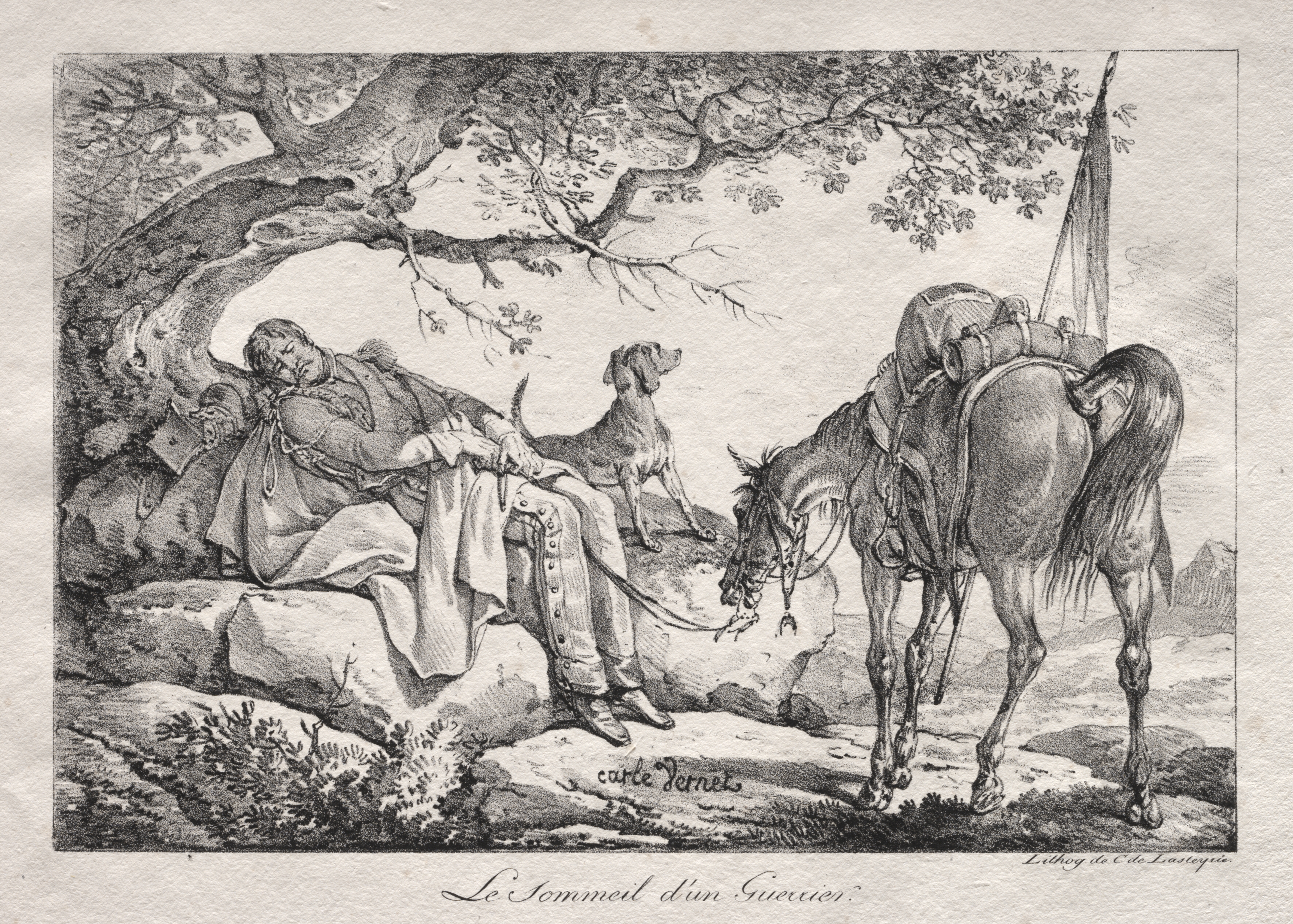 The image depicts a black and white drawing of a sleeping soldier. The soldier sits on a rocky outcropping, resting his head on his right hand. He wears a military uniform with buttons on the side of his pants and a sword at his side. A dog sits on a lower rock behind him. To the right of the soldier, a horse stands with its head down, wearing a saddle and bridle. The horse has a flag attached to its saddle. The background shows a tree with sprawling branches and a distant mountain range. The scene is framed by a thin border, with a thicker border around that, and cursive text at the bottom. The text at the bottom reads "Le Sommeil d'un Guerrier" and appears to include the artist's name.