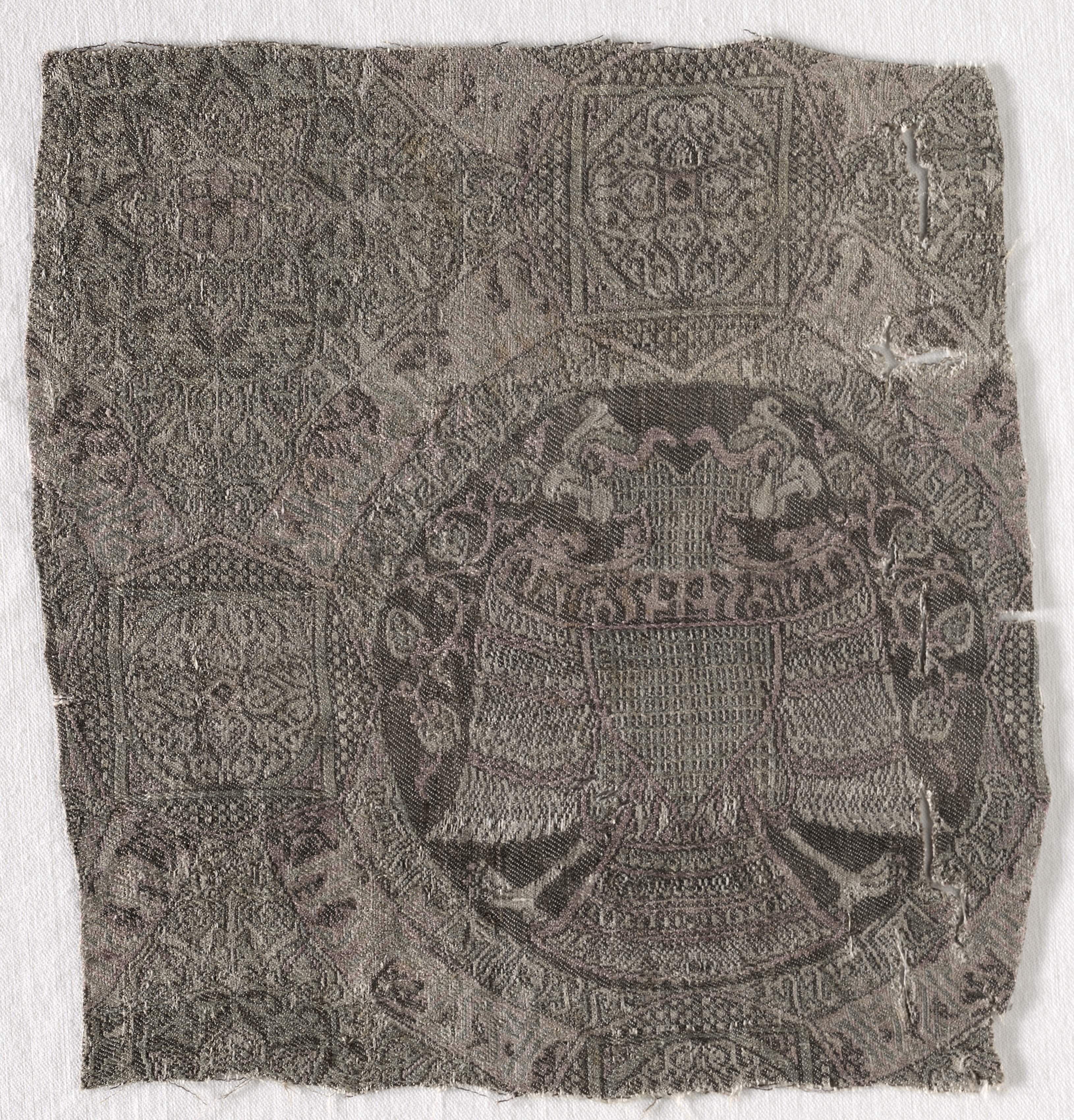 Gray fabric with intricate design, square shape with frayed edges, circular pattern in center, surrounded by squares and other shapes, on a white background; "Fragment" by an unknown artist.