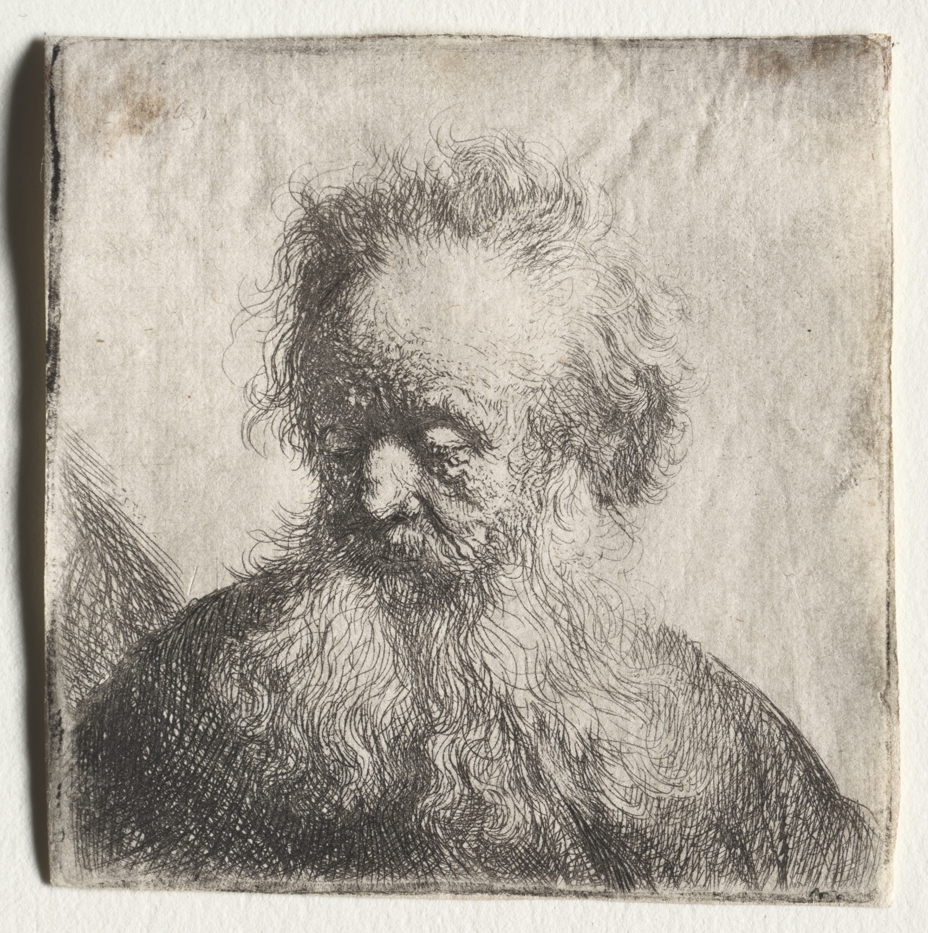 The image shows an old man with a flowing beard. The man has unkempt hair and a long, bushy beard. The man looks to his right. The man wears a dark shirt. The background is a light gray color. The drawing is a black and white sketch. The sketch is on a square piece of aged paper.
