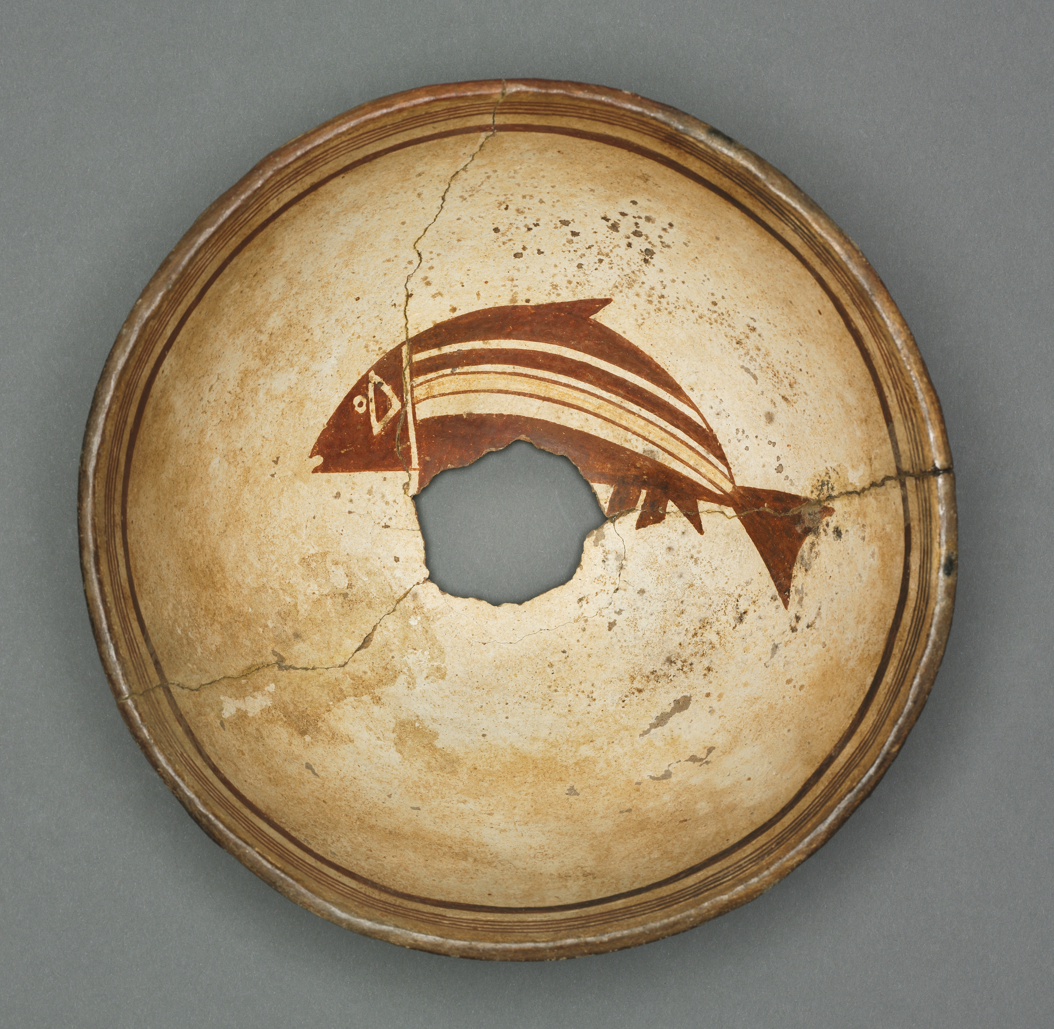Tan ceramic bowl with rounded rim and double-lined brown bands around rim. Fish painted on bowl in brown with white eye; three curved stripes on body, tail pointed. Hole in center of bowl. Artist: ancient Greek. Title: Bowl.