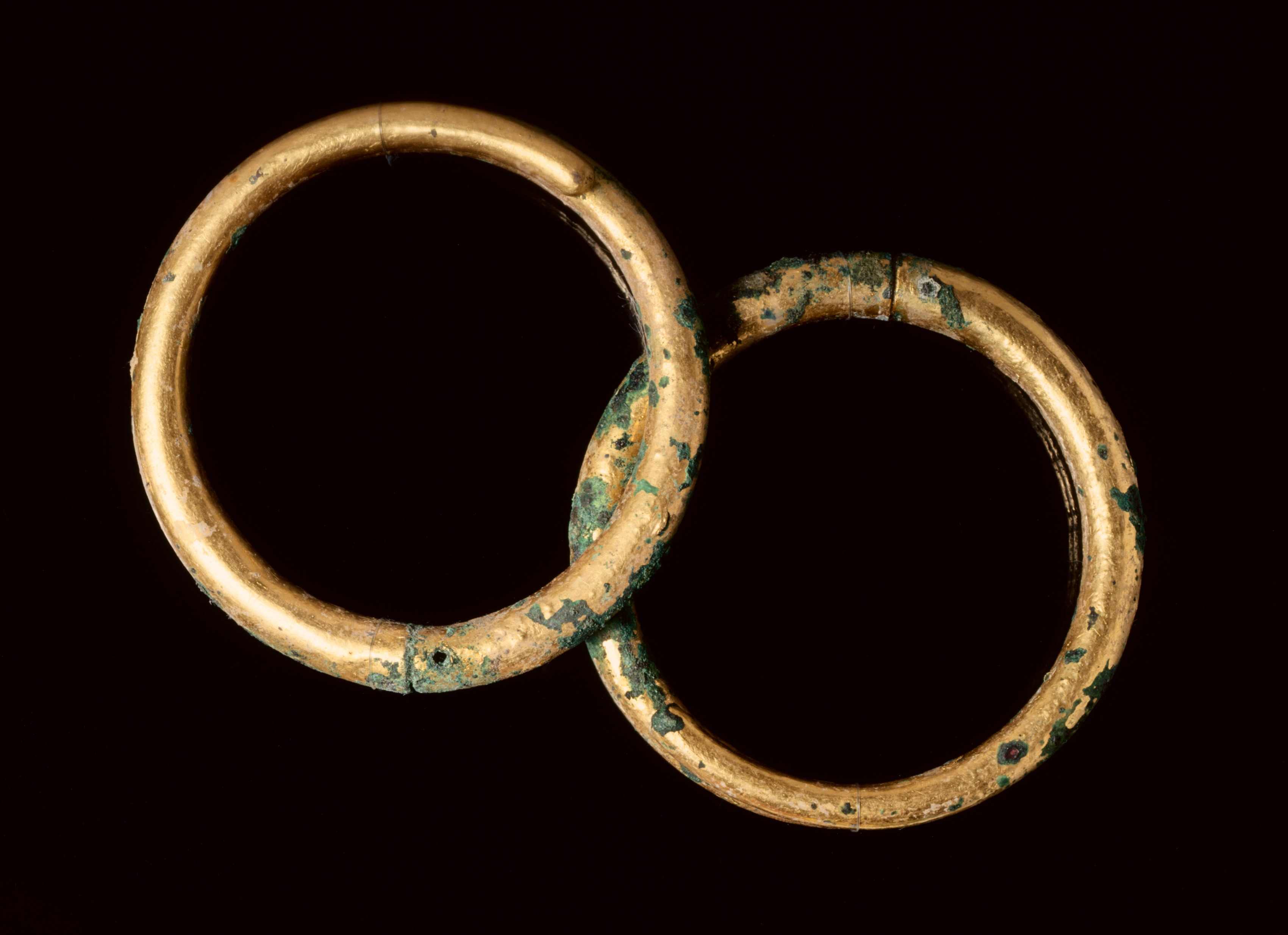 The image shows a pair of gold bangles. The bangles are circular and made of gold-colored metal. They are overlapping in the middle. The bangles have a smooth surface with small spots of green patina. There are visible signs of wear and tear. The bangles are not perfectly round. They are displayed on a black background.