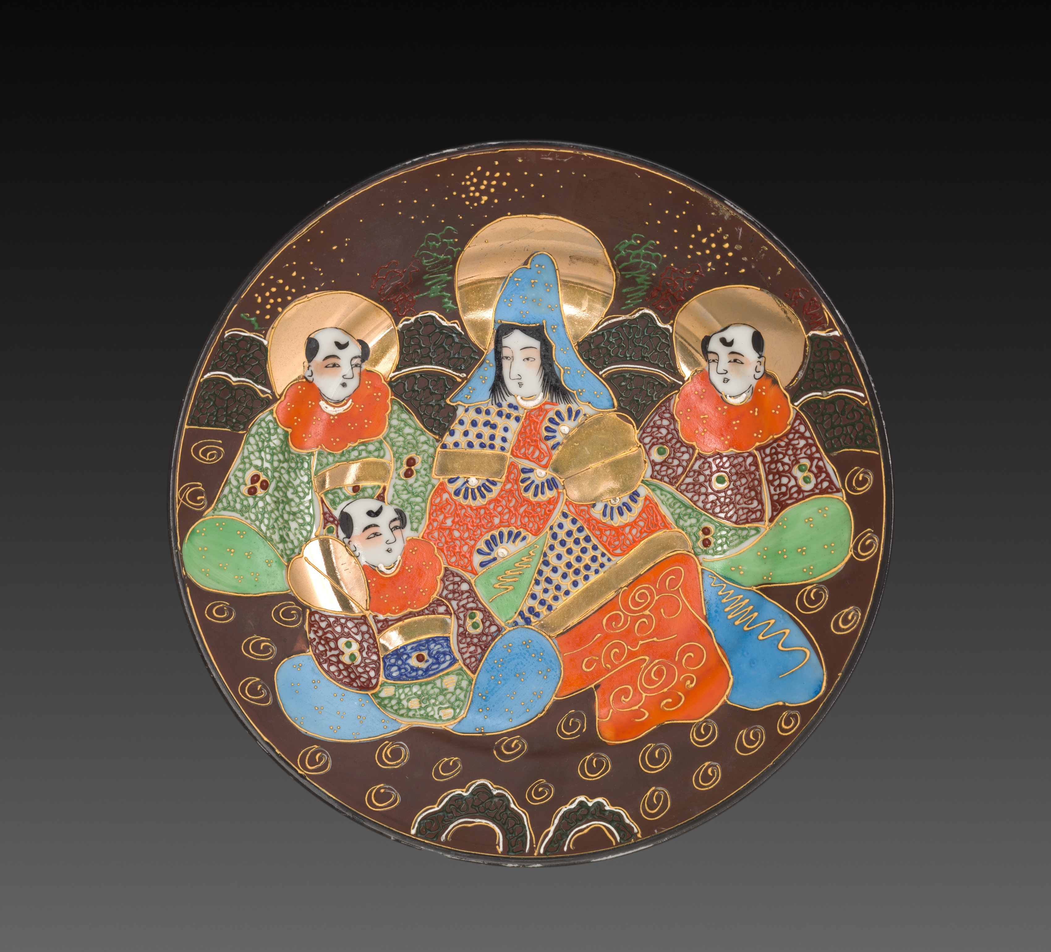 The plate, by artist Namikawa, depicts four people. The central figure sits cross-legged wearing a blue head covering, with gold accents on a blue base, and a dress with a blue and gold pattern on a red base. Two people on either side of the central figure wear similar gold-accented head coverings on their heads. All four people have white face paint with black designs around their eyes and foreheads. The sitting people wear traditional Japanese clothing featuring various patterns on their kimonos, predominantly using shades of green, red, orange and brown. Gold accents outline the clothing and hair of each person. The background of the plate is dark brown with gold swirling patterns on the lower half. A row of brown waves are accented with gold at their tops. A gold background behind all four figures features an area of orange and green. A dark gradient fills the background.