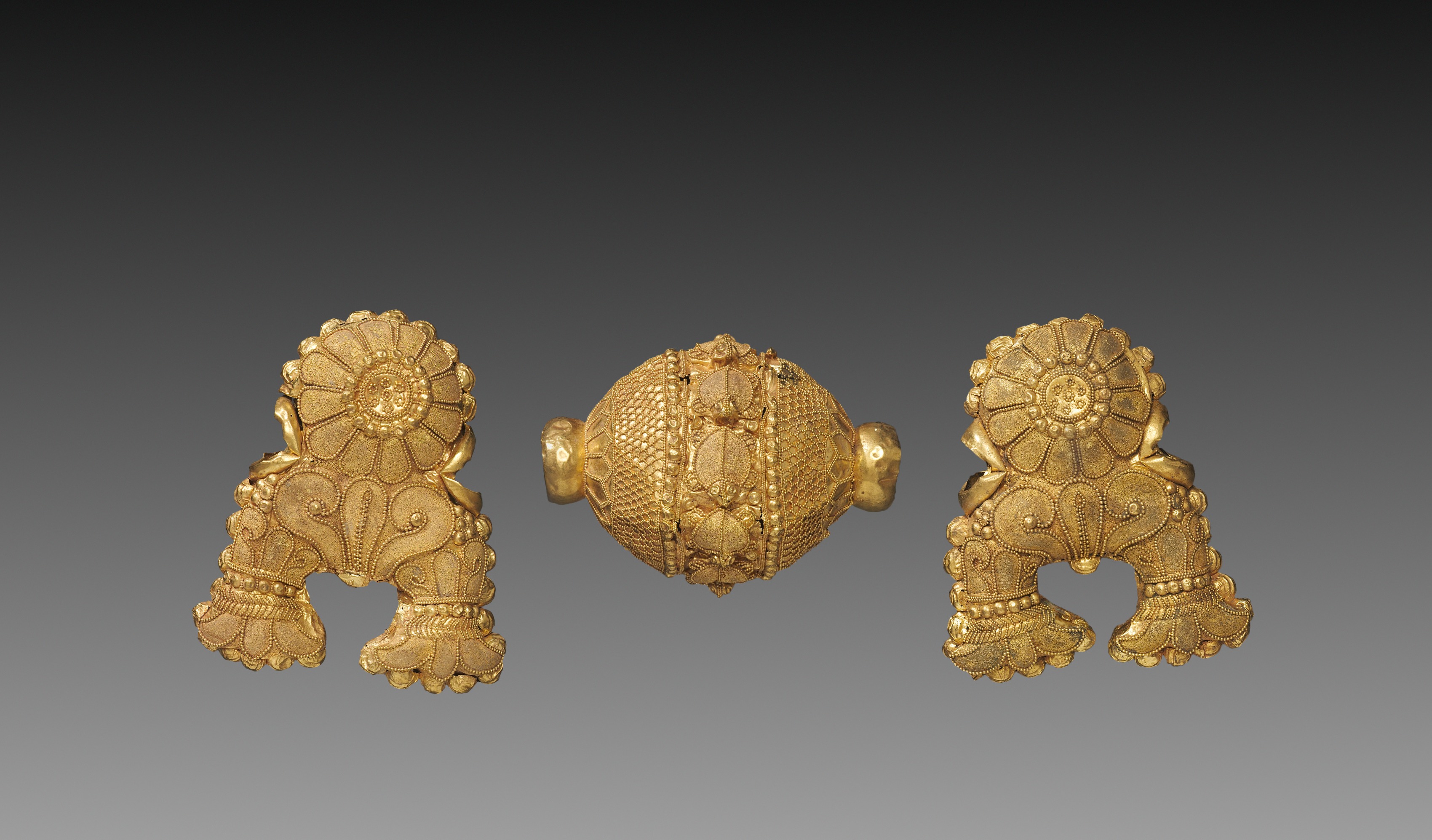 Golden jewelry pieces against a gray background. A single bead and two pendants. The bead is spherical with protrusions on either side and a pattern all over. The pendants have a flower on top and are similarly decorated. All pieces are gold-colored. Two are shown from the front and one from the back.
