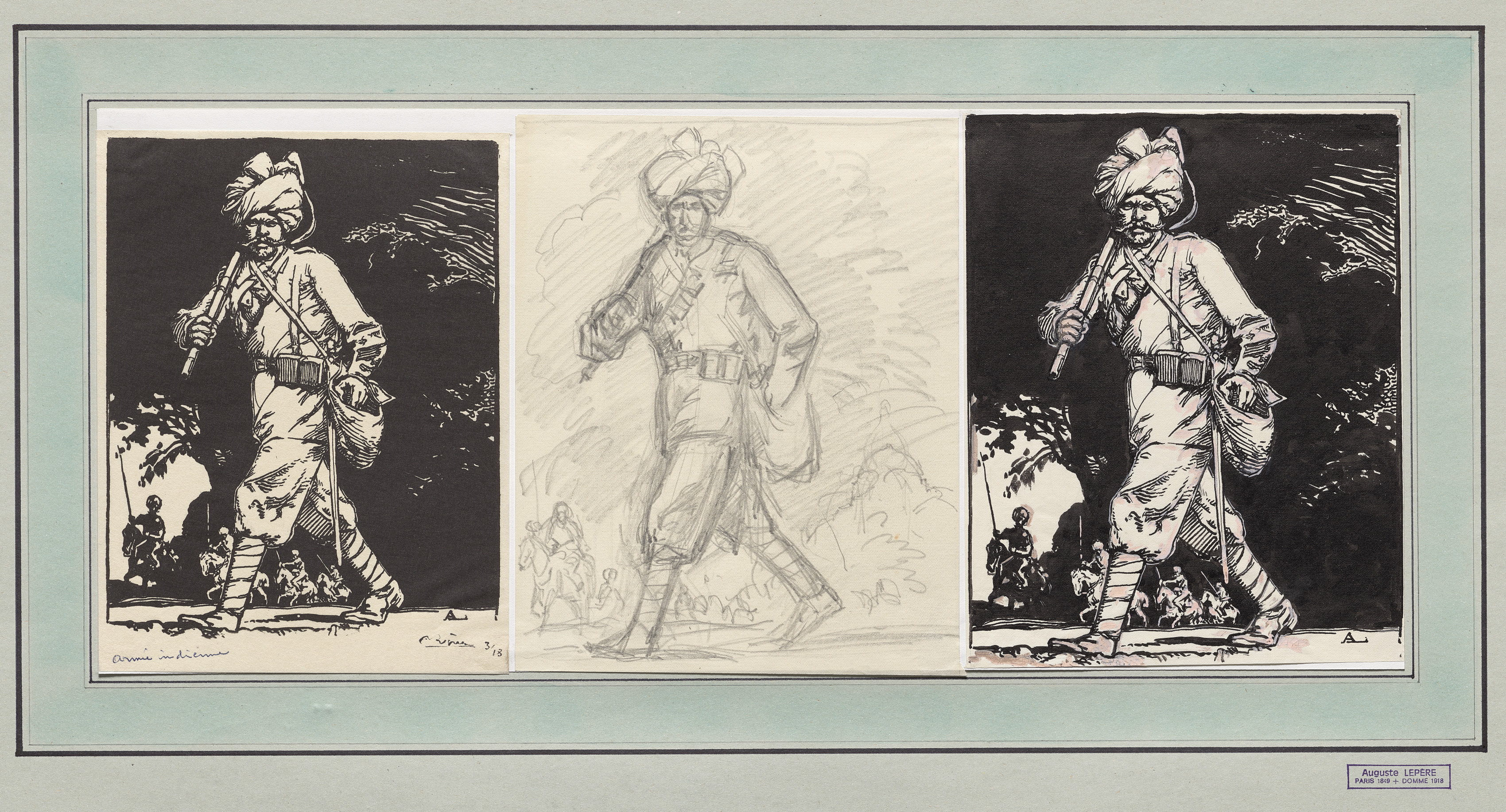 Black and white artwork of a man in a turban and traditional Indian clothing walking while holding a long stick. The artwork consists of three sections. The left and right sections are identical and show a man walking to the left. The man wears a long tunic and pants. The man has on a turban on his head and a bag on his hip. The right and left images are mirror images. The center image is a pencil sketch of the man. The background of the left and right sections is black with white trees in the background. The background of the center image is a light tan color with a sketch of trees. The entire piece is surrounded by a light blue border. The artist's name and dates are printed on the bottom right.