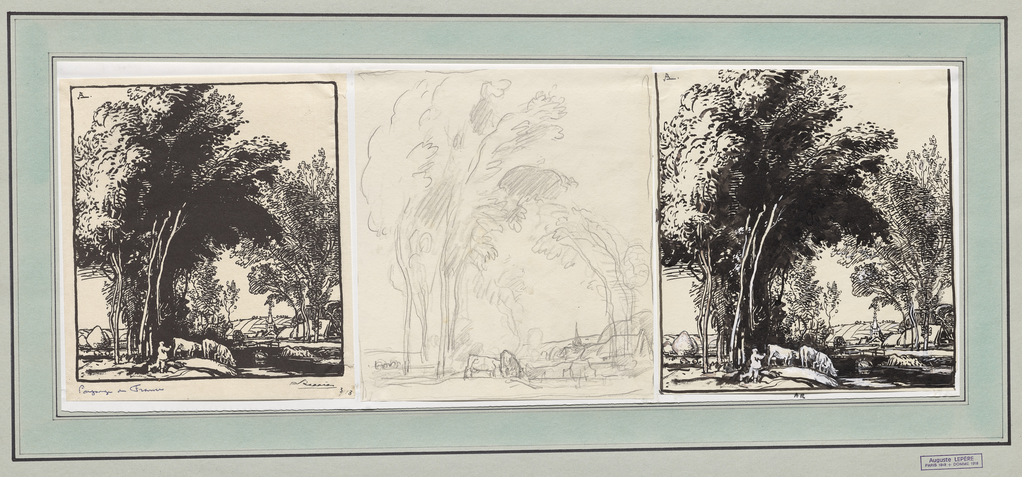 The image shows a triptych artwork titled "Paysage de France" by Auguste Louis Lepère. The artwork is in a landscape orientation and consists of three panels. The left and right panels are identical, while the middle panel is a pencil sketch. The left and right panels feature a black and white drawing of a landscape with several trees in the foreground. The trees have thick trunks and leafy canopies. In the background, there are more trees and what appears to be a small building or structure. The middle panel shows a pencil sketch of a similar landscape, with several trees and what appears to be a small building or structure in the background. The artwork is surrounded by a light green mat with a thin black border. There is a small label in the bottom-right corner of the mat. The overall style of the artwork is reminiscent of traditional French landscape art.
