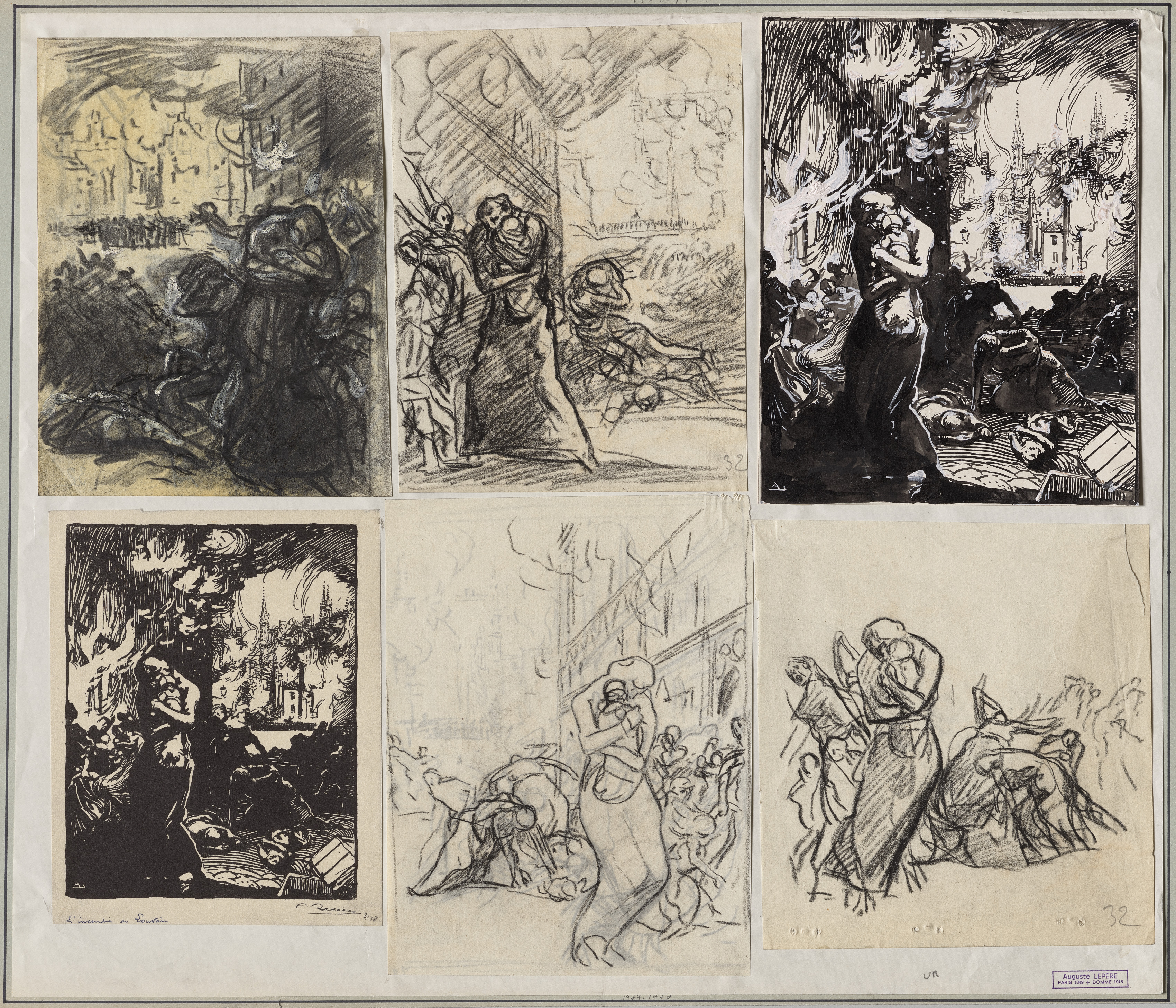 The image shows a collection of six sketches. The top row has three sketches. The left one is in shades of gray and shows people in a town on fire. The middle sketch is in shades of gray and shows people running from a burning building. The right sketch is in black and white and shows a woman holding a child with a city on fire behind her. The bottom row has three sketches. The left one is in black and white and shows people in front of a burning building. The middle sketch is in shades of gray and shows people running from a burning building. The right sketch is in shades of gray and shows people running with a horse. The sketches appear to depict the Louvain fire. The artist's style is detailed and expressive, with bold lines.
