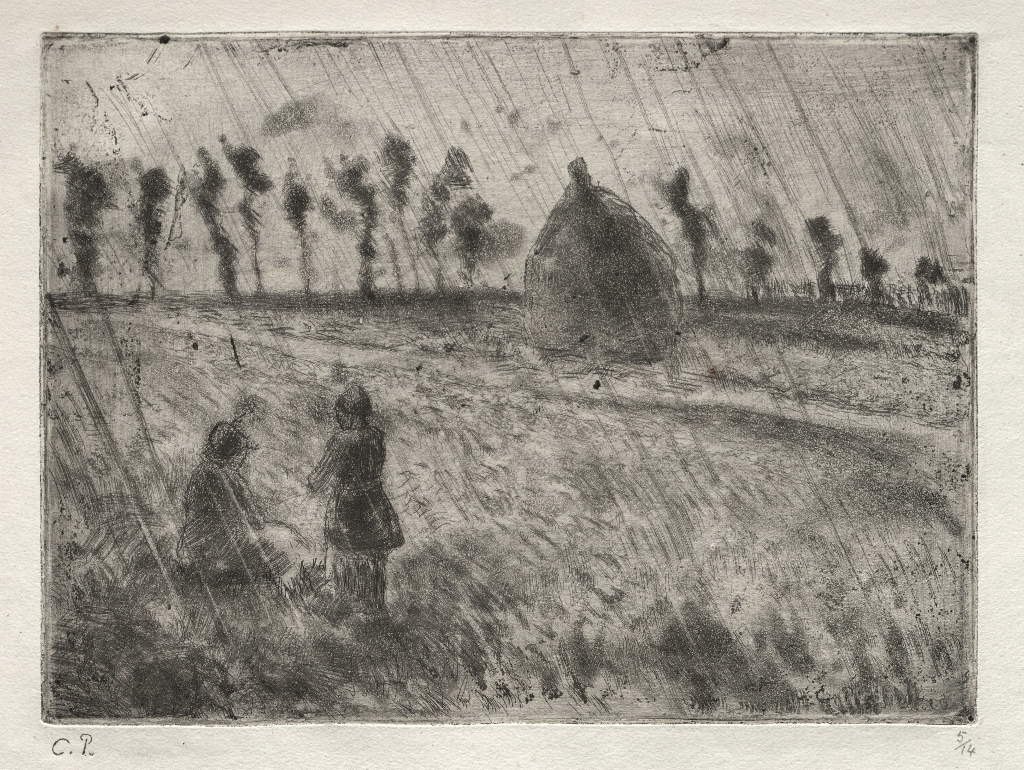 The image depicts a grayscale artwork titled "Rain Effect" by Camille Pissarro. The artwork shows a landscape scene with two people in the foreground, wearing dark clothing and hats, and facing away from the viewer. They are positioned on the left side of the image in a field with short grasses. In the background, there is a large haystack or barn and a line of trees. The sky is filled with diagonal lines representing rain falling. The image has a rough texture and appears to be a print or etching. The color palette is grayscale, ranging from light to dark. The image is surrounded by a white border. The artist's signature "C.P." is visible in the bottom-left corner. A small number "5/14" is written in the bottom-right corner.