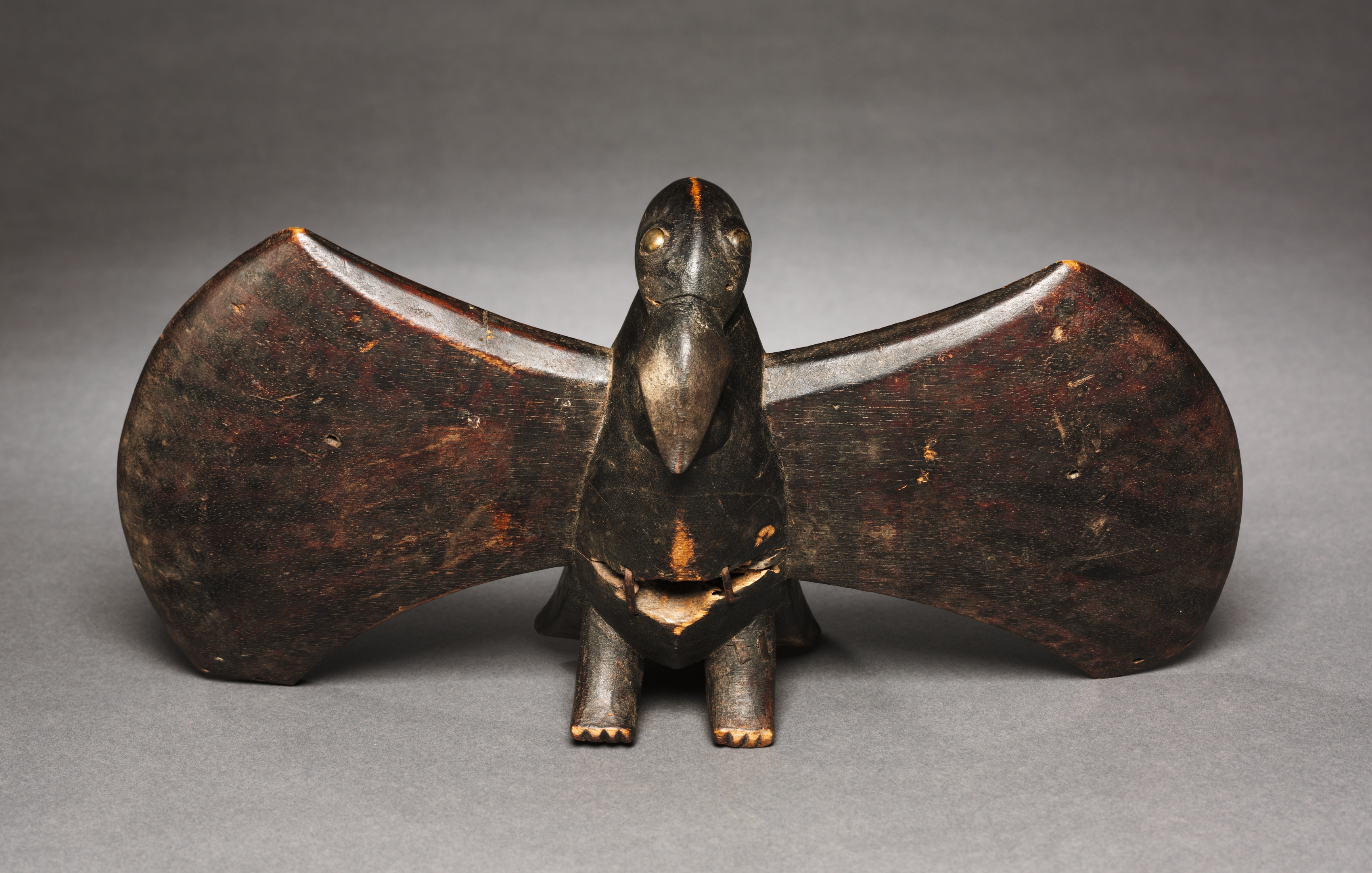 The wooden sculpture depicts a bird with outstretched wings. The bird has a dark brown patina with lighter brown and gold accents. The bird has a large head with a sharp beak, two small golden eyes, and a body with two legs. The body is positioned between two large, curved wings that are spread out to the sides. The wings are also dark brown with lighter brown accents. The background is a gray gradient, with the sculpture sitting on a light grey surface. The overall style of the sculpture is primitive or folk art. The title of the piece is "Bird Standard".