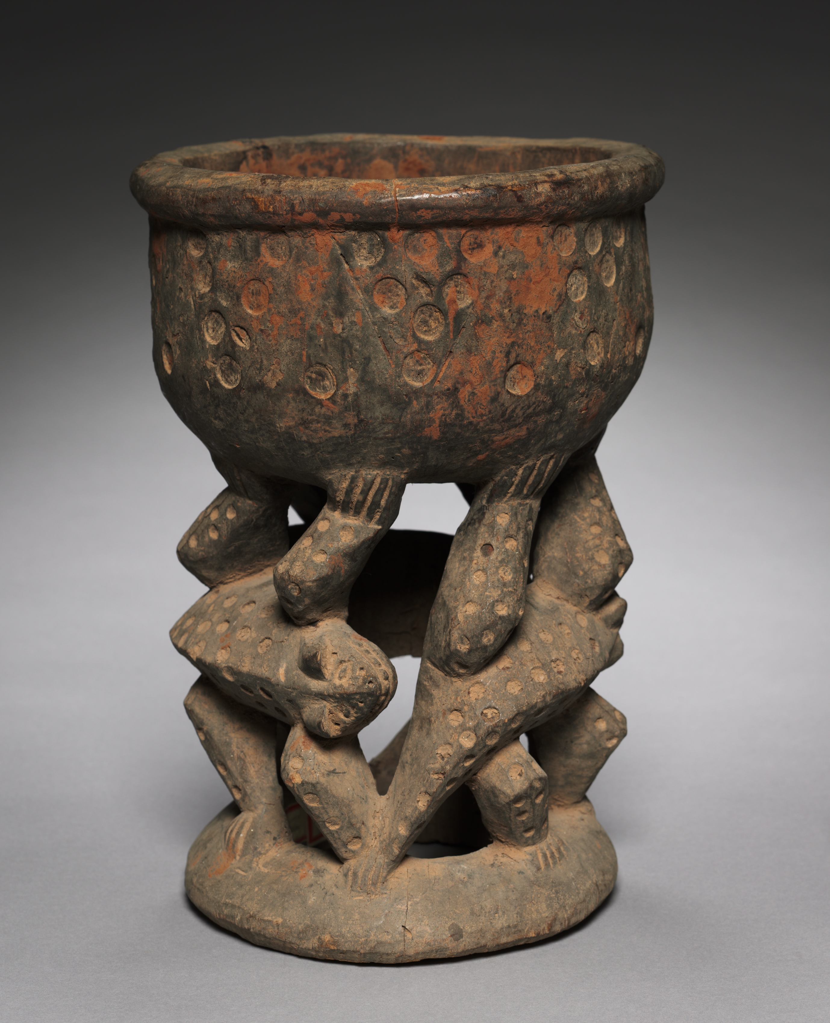 Brown clay bowl with a wide mouth and circular indentations on the exterior sits on a base featuring four figures with hands stacked on one another. The base is round. The background is dark gray at the top and light gray at the bottom. "Stand or Bowl", Yoruba.