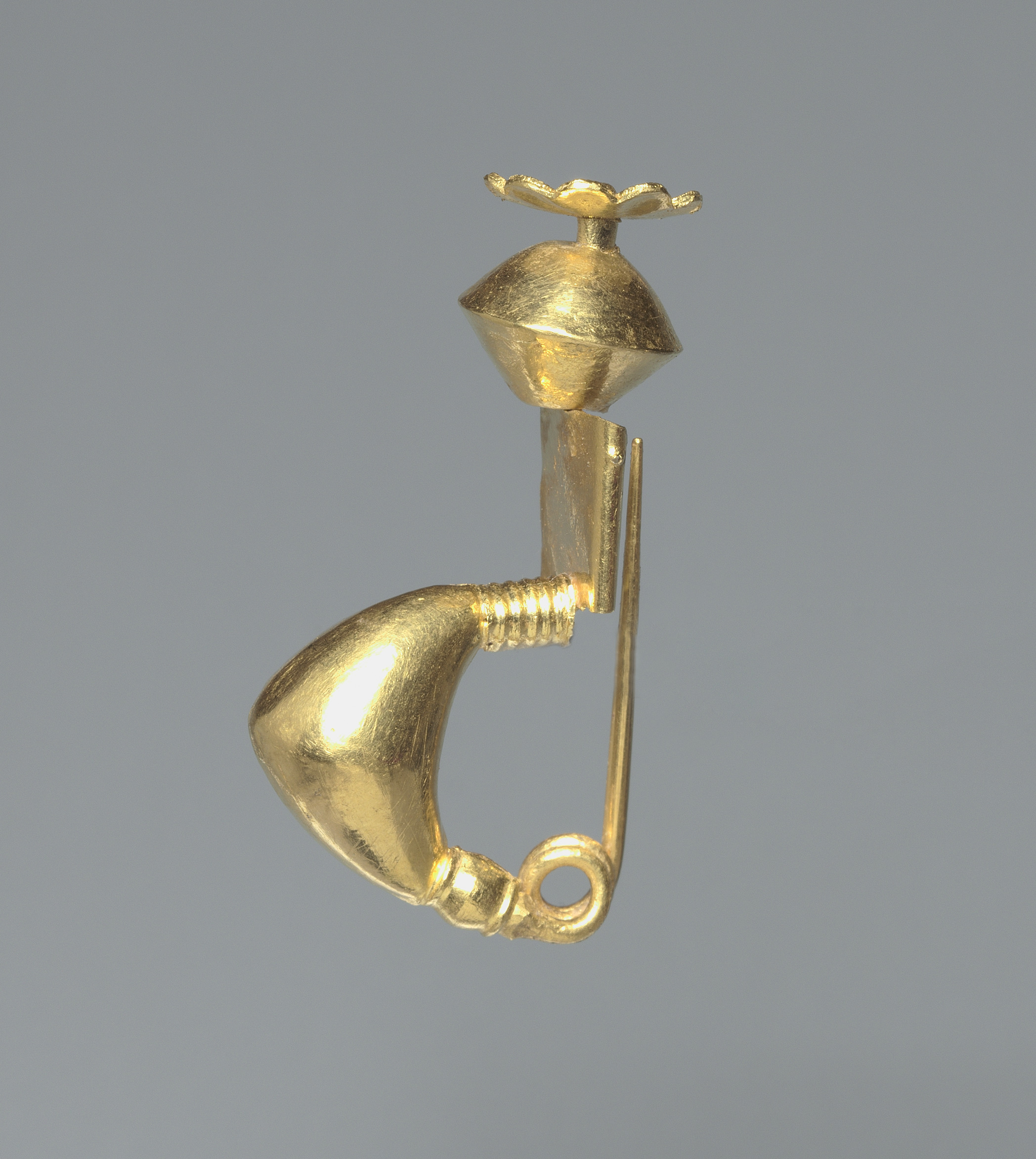 Golden fibula with a hinge and pin. The fibula is gold-colored, with a long pin connected to a spring-loaded hinge. The pin is long and thin. The body of the fibula is shaped like a horn or a hook. Above the hinge is a domed section with a flower-like motif on top. The background is gray. The artist of the fibula is unknown. Fibula (Pin).