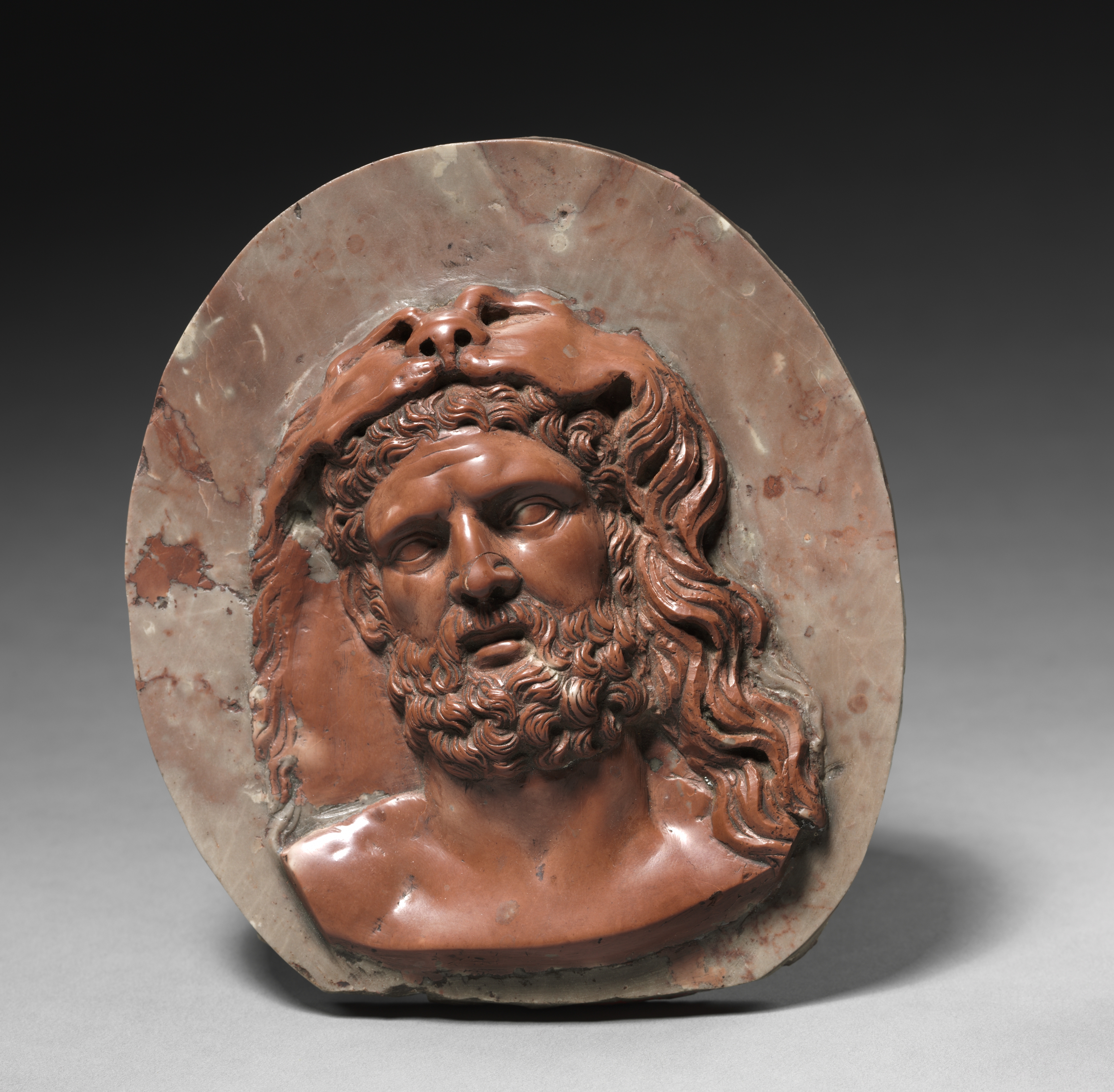Oval relief sculpture of a man's head and shoulders titled "Hercules" by an unknown artist. The man has a muscular build and long wavy hair and beard. A lion's head and feet are on top of his head. He is sculpted from reddish-brown stone. The background is a gradient from black to gray. The oval relief has a marble-like appearance with shades of pink and white.
