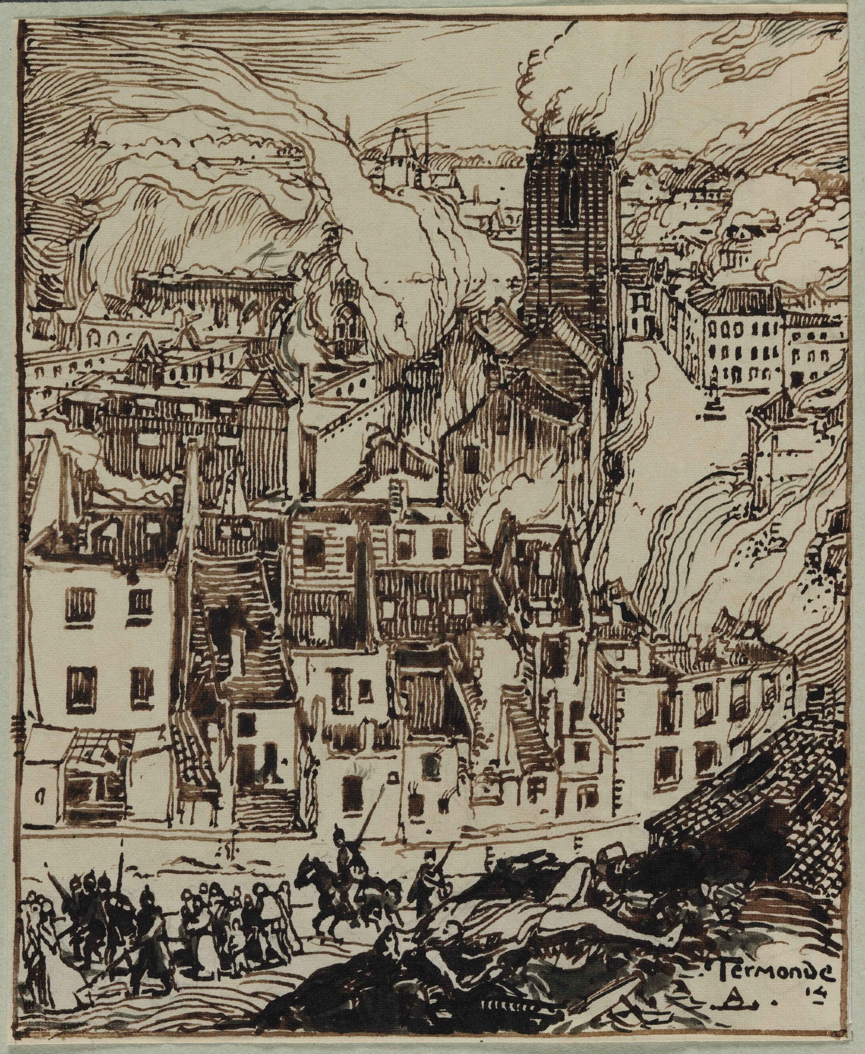 The image depicts a cityscape with buildings on fire. The cityscape is drawn in black and brown lines on a beige background. The buildings are multi-story, with steeply pitched roofs and chimneys emitting smoke. Some buildings are engulfed in flames, with large plumes of smoke rising into the air. In the foreground, a group of people are gathered, some on horseback and some on foot. They appear to be soldiers or military personnel, armed with weapons. The overall atmosphere suggests a scene of destruction and chaos. The artist's signature "Termonde" and the year "15" are visible in the bottom-right corner.