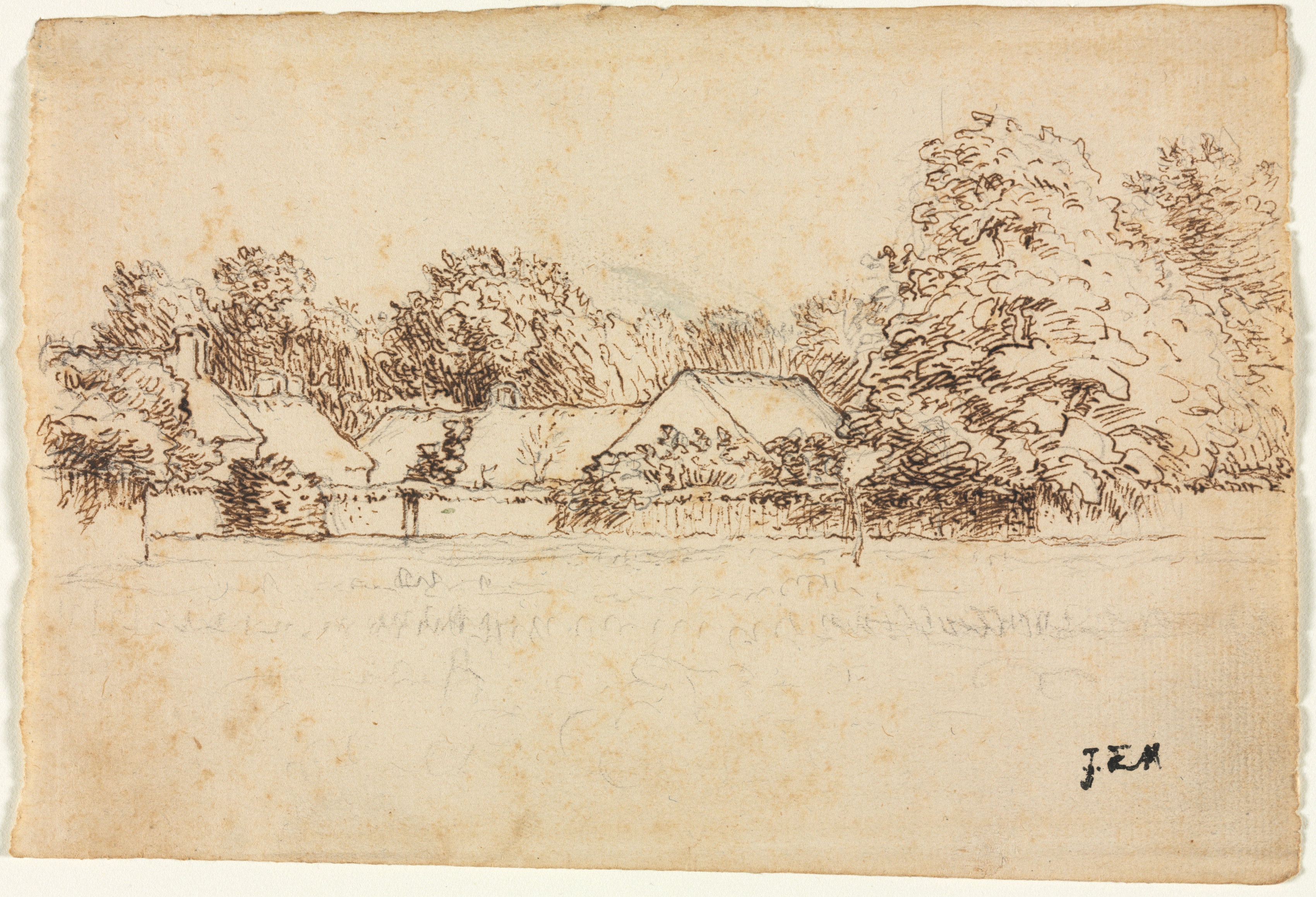 The image depicts a sketch of cottages. The sketch is drawn on aged paper with rough, torn edges. The drawing is in brown ink and depicts several cottages with sloping roofs. The cottages are surrounded by trees and bushes. The foreground is mostly empty except for a few scribbled lines. The artist's initials "JFM" are written in the bottom-right corner. The background of the paper is stained and discolored. The cottages appear to be rural and simple in design. The trees and bushes are densely packed around the cottages. The overall scene is serene and peaceful. The title of the work is "Cottages" by Jean-François Millet.