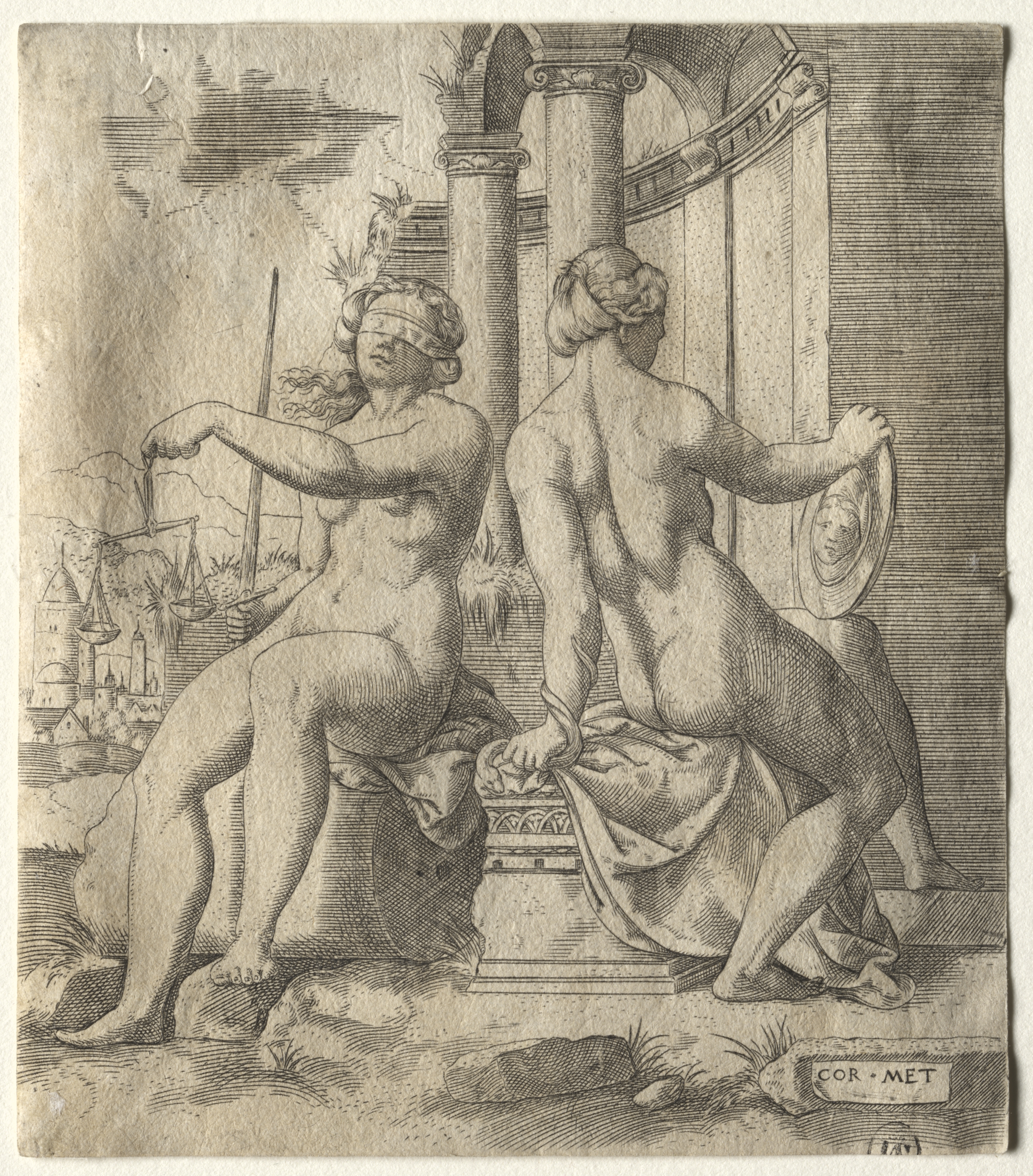 The image depicts two nude female figures seated on a stone bench. The figure on the left has long wavy hair and wears a headband with feathers; she holds a sword in her right hand and a scale in her left. The figure on the right has her back to the viewer, with her hair tied up; she holds a mirror in her left hand and places her right hand on the bench. In the background, there are three columns with ornate capitals; a cityscape with buildings and a ship can be seen on the left. The scene includes a landscape with rocks and grass at the base of the figures. The style of the image is detailed and engraved. The title of the work is "Justice and Prudence" and the artist is Cornelis Massys.