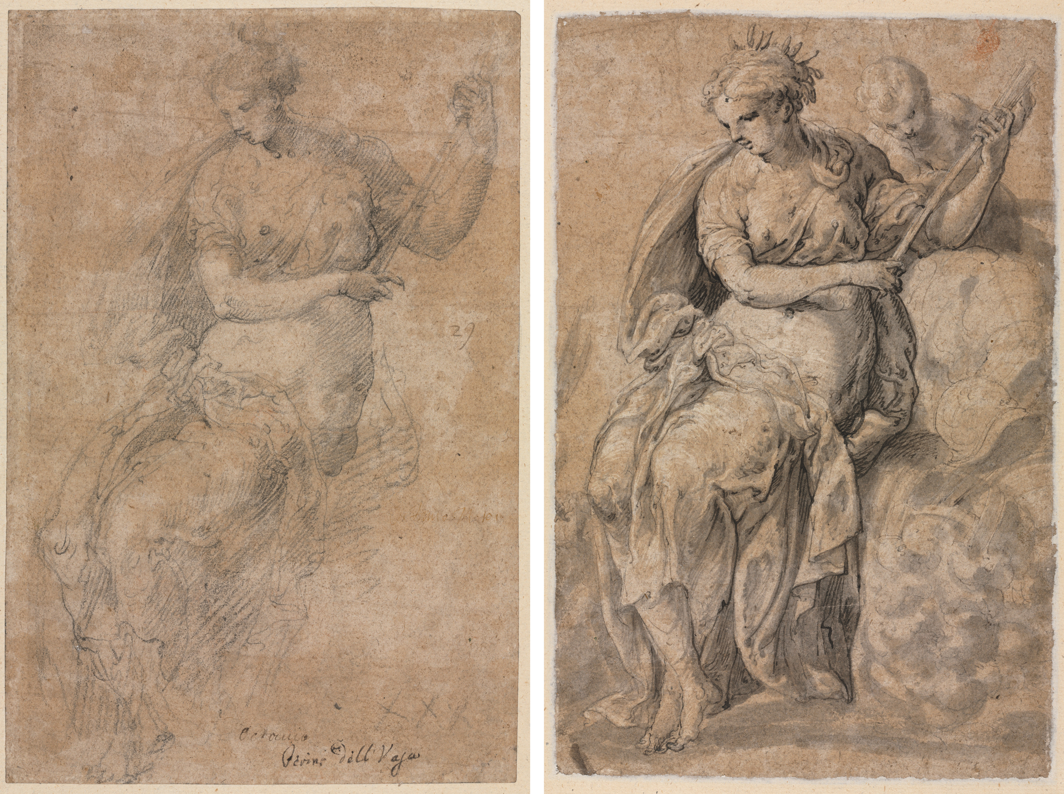 The image shows two sketches of a figure. The left sketch depicts a woman with short hair wearing a dress and cape, seated and looking down, her right arm bent at the elbow and her left arm raised. Her left leg is bent and visible from the knee down. The right sketch shows a woman with short hair wearing a crown, a flowing dress, and a cape. She sits on a rock with a putto behind her to the right. The woman holds a staff in her left hand and her right hand is across her body. She is barefoot. The background of both sketches is mottled brown. The sketches appear to be drawn on aged paper. The style of the sketches suggests they are from the Renaissance period.