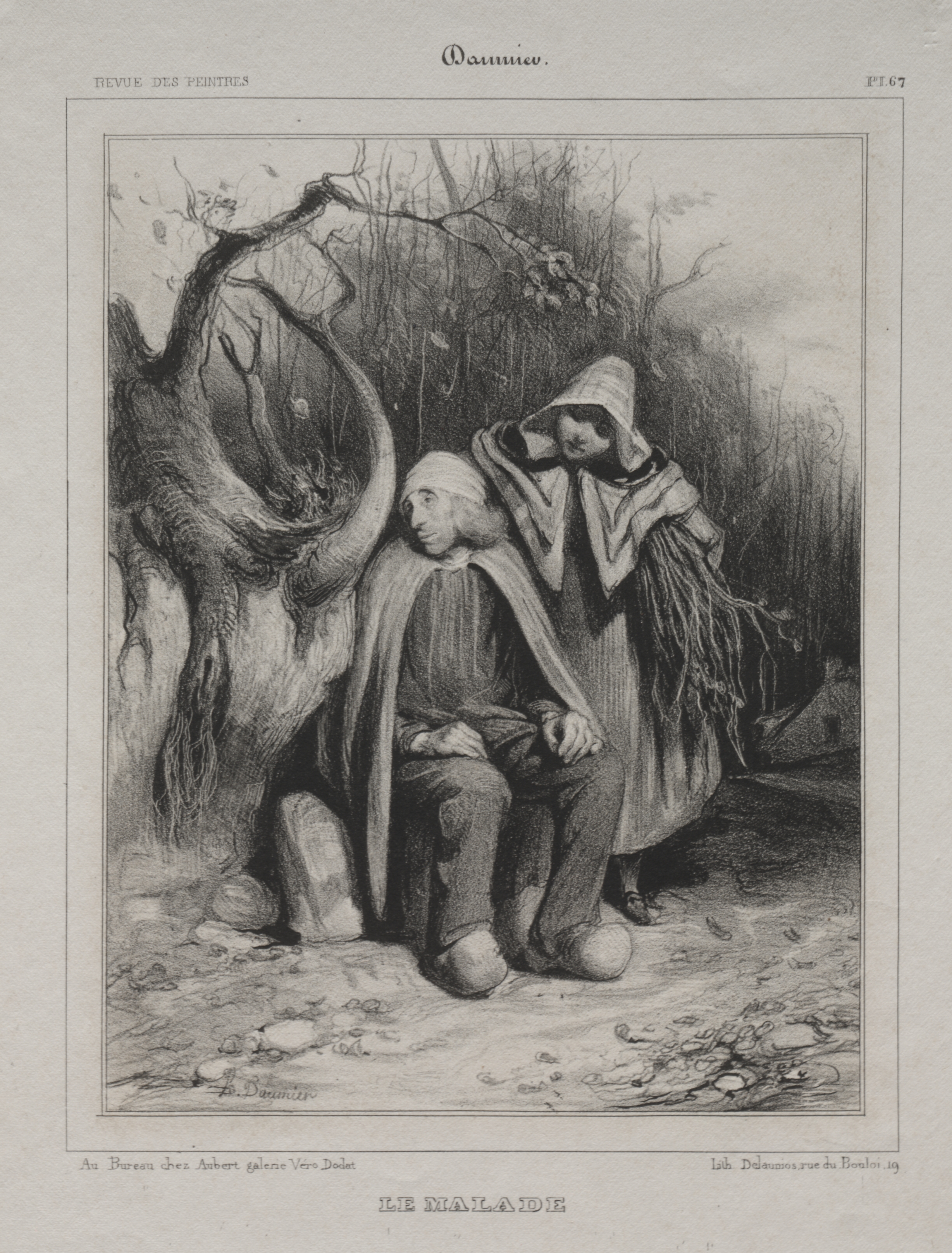 The image depicts an illustration by Honoré Daumier titled "The Invalid". The illustration is in black and white and shows a man sitting on a tree stump with a woman standing beside him. The man wears a turban-like head covering, a long-sleeved top, loose pants, and slippers. His posture is slouched, with his head bowed down and arms resting on his knees. The woman stands to his right, wearing a hooded cloak with a striped pattern; her head is covered. She appears to be supporting or comforting the man. Behind them is a large tree with twisted branches and some foliage. The background includes more trees and a cloudy sky. The scene suggests a somber mood, possibly indicating illness or hardship. The text at the top reads "Revue Des Peintres" on the left and "P.167" on the right, with "Wamiee" centered. At the bottom, small illegible text is followed by "LE MALADE". The illustration is bordered by a thin line.