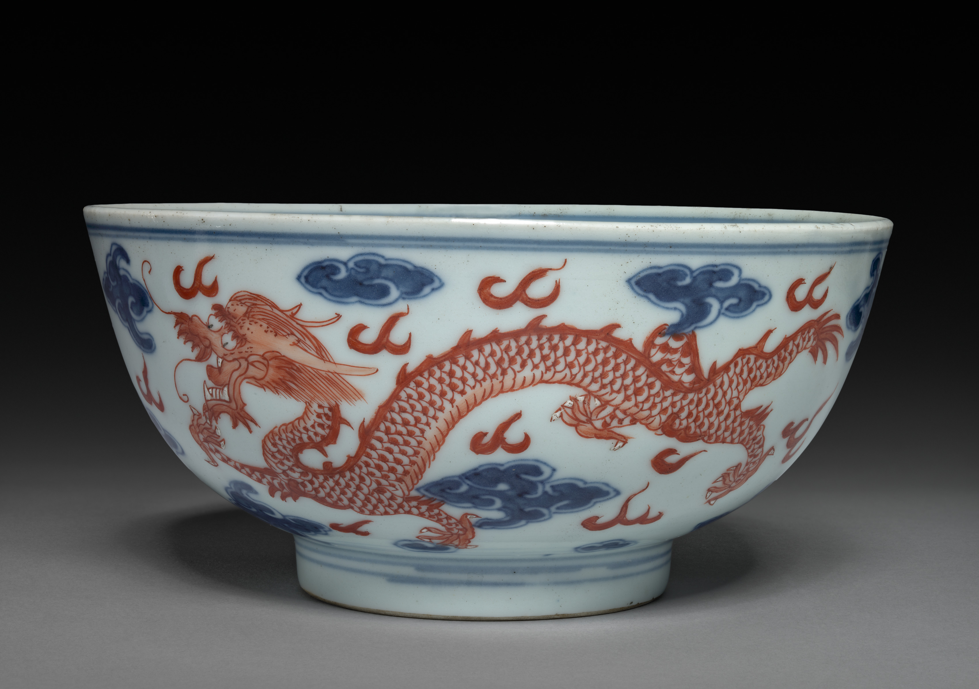 White ceramic bowl with a wide mouth and a narrow base. The bowl features a red dragon design on the exterior, depicted in a curved line encircling the bowl's body. The dragon has five claws. The dragon's body has scales. The dragon's head faces left. The bowl's exterior also features blue cloud designs. The bowl's interior is not visible. The bowl's background is black. The artist of the piece is unknown. The title of the piece is "Bowl".