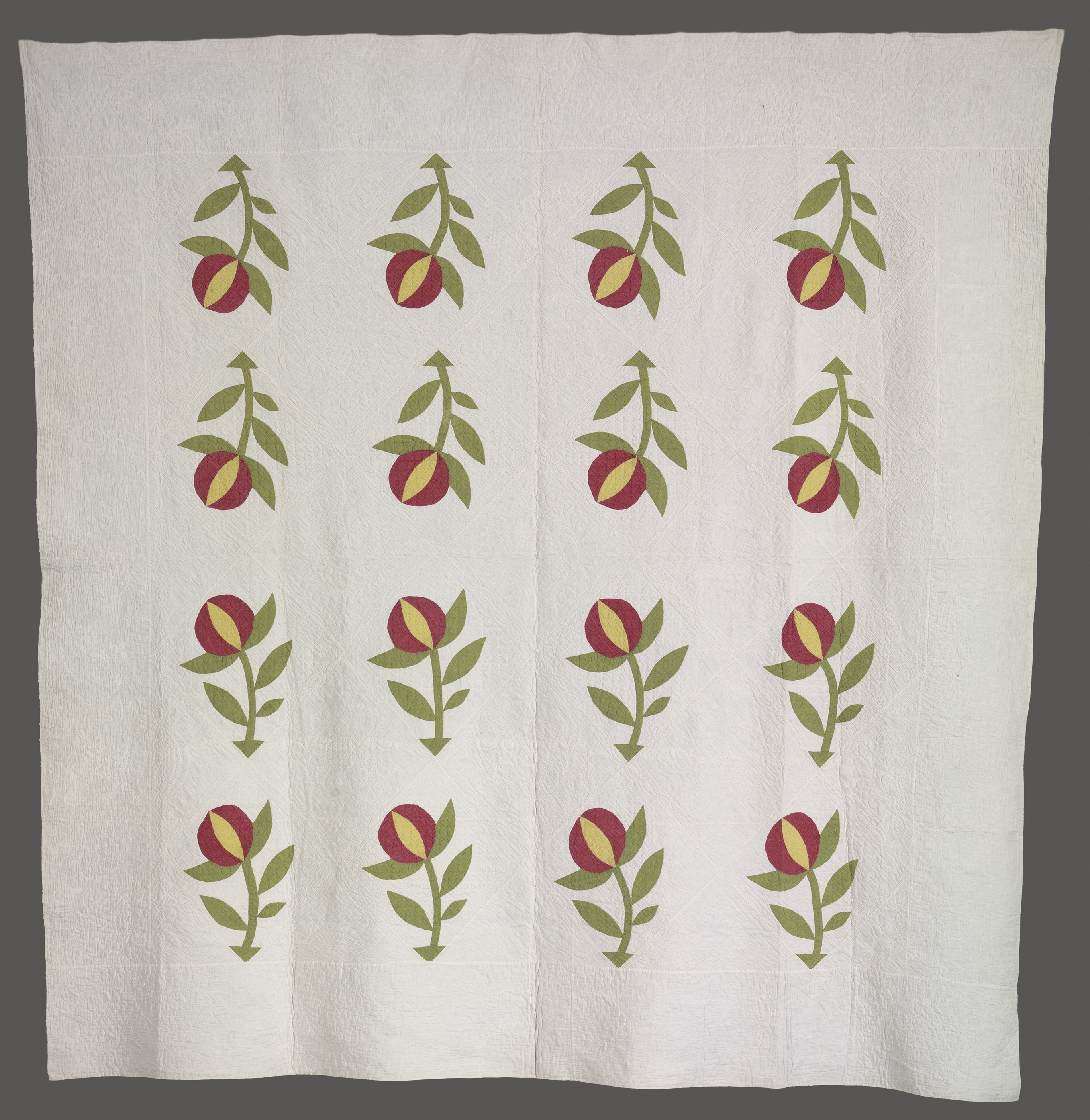 White quilt with 15 peach designs. The peaches are red with a yellow patch. They have a stem with green leaves. The quilt is made of squares with visible stitching. The quilt is hanging on a dark background. The title of the quilt is "Quilt" and the artist is not specified.