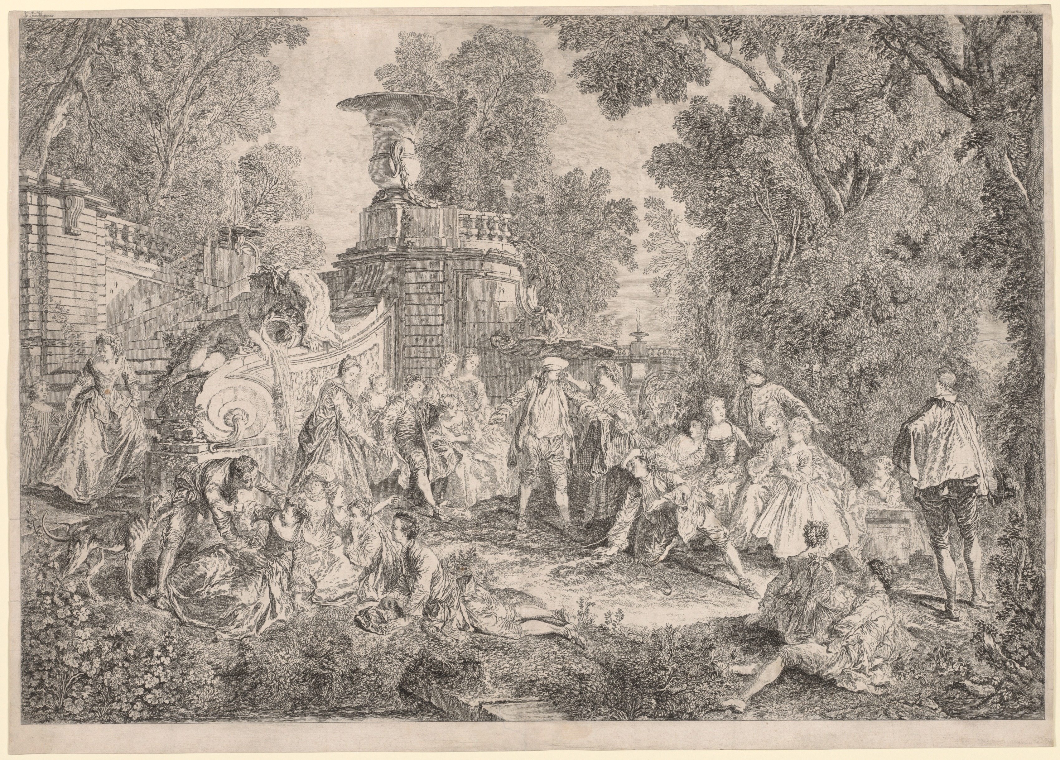 Black and white illustration of a group of people playing a game outdoors. A stone wall is on the left and trees are on the right. A short stone bridge is in the background. One person with their eyes covered by a cloth is in the center. The others are reaching out toward them. A few people are standing; most are sitting on the ground. One man on the right is wearing a hat, a loose shirt, and short pants. Two women are wearing dresses and hats. A few people are wearing wigs. A dog is on the left. Bushes and flowers are in the foreground. A statue is on top of a stone plinth on the left. A decorative stone balustrade surrounds the plinth. A boat with a decorative stern is behind the group on the left.