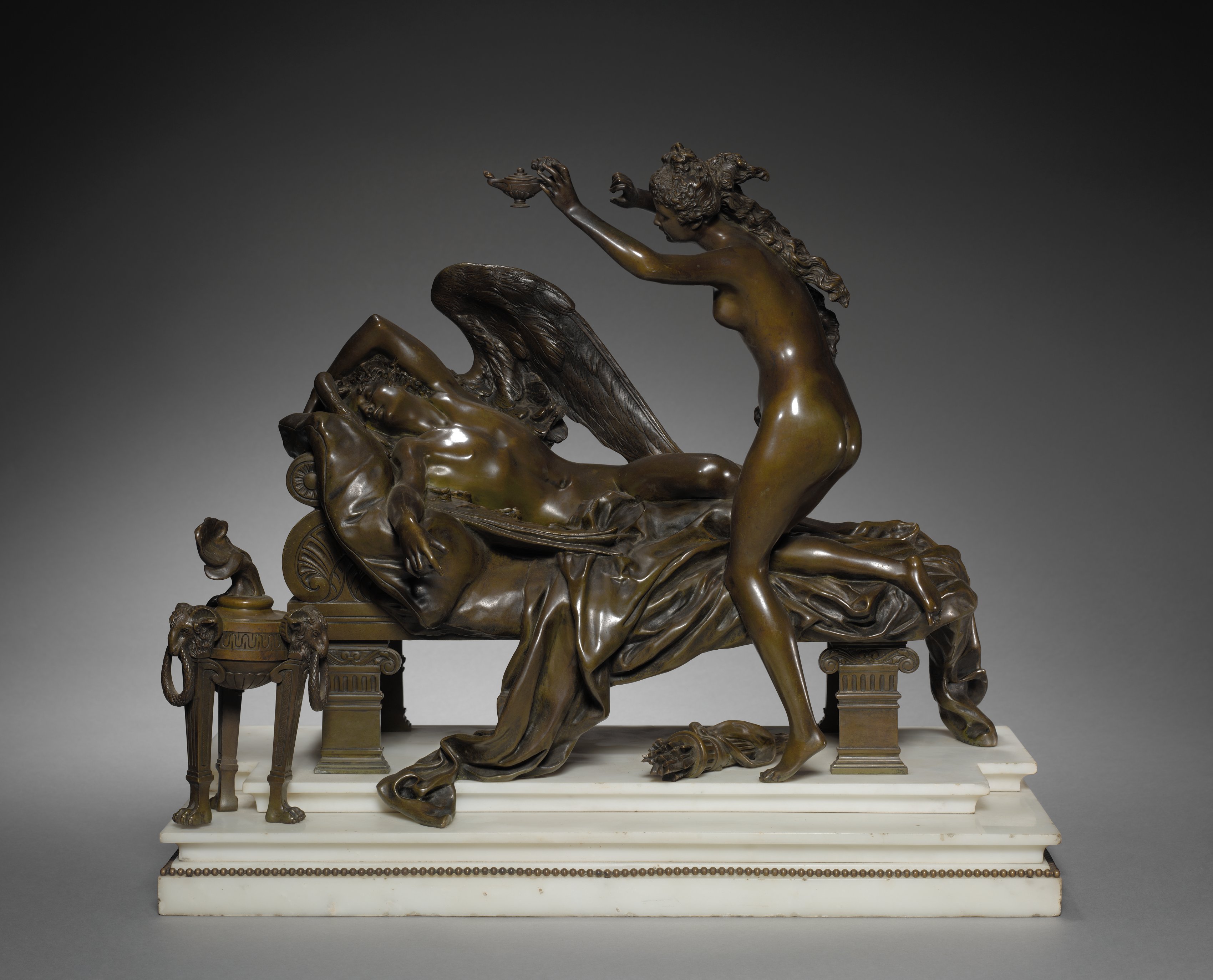 The sculpture depicts two figures on a bed. One figure, a woman, sits on the right side of the bed, leaning forward with her left arm extended upward. The woman's right leg is extended forward. She is naked, has long hair, and holds a small pot in her right hand. The other figure, a man or a winged god, lies on his back on the bed with his body facing left. He appears to be asleep or unconscious. A wing protrudes from his back. The bed has a headboard and a footboard with columns. A small table with a bird on top sits to the left of the bed. The sculpture is bronze with a brown patina. It sits on a white marble base with a decorative trim. The background is a gradient from dark gray at the top to light gray at the bottom.