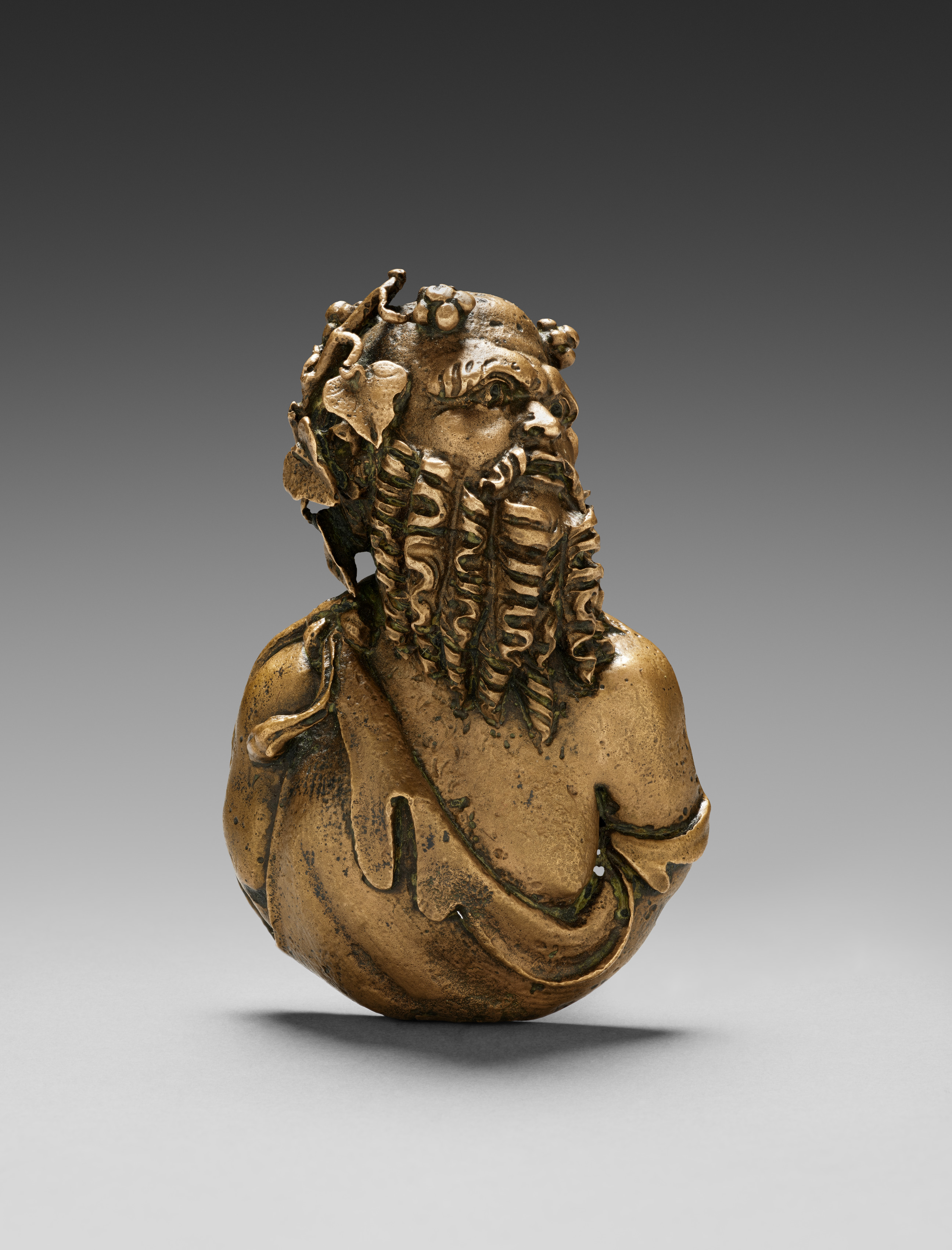 Bronze bust of a man with curly hair and a beard, viewed from the side. The bust is angled to the right, showcasing the subject's profile. The man has long, curly hair that falls to his shoulders, with leaves woven into it. He also has a beard. He appears to be wearing a cloth around his body. The background is a gradient of dark gray at the top to light gray at the bottom. The title of the piece is "Silenus Bust for a Couch" by the artist Aldo Bonadei.