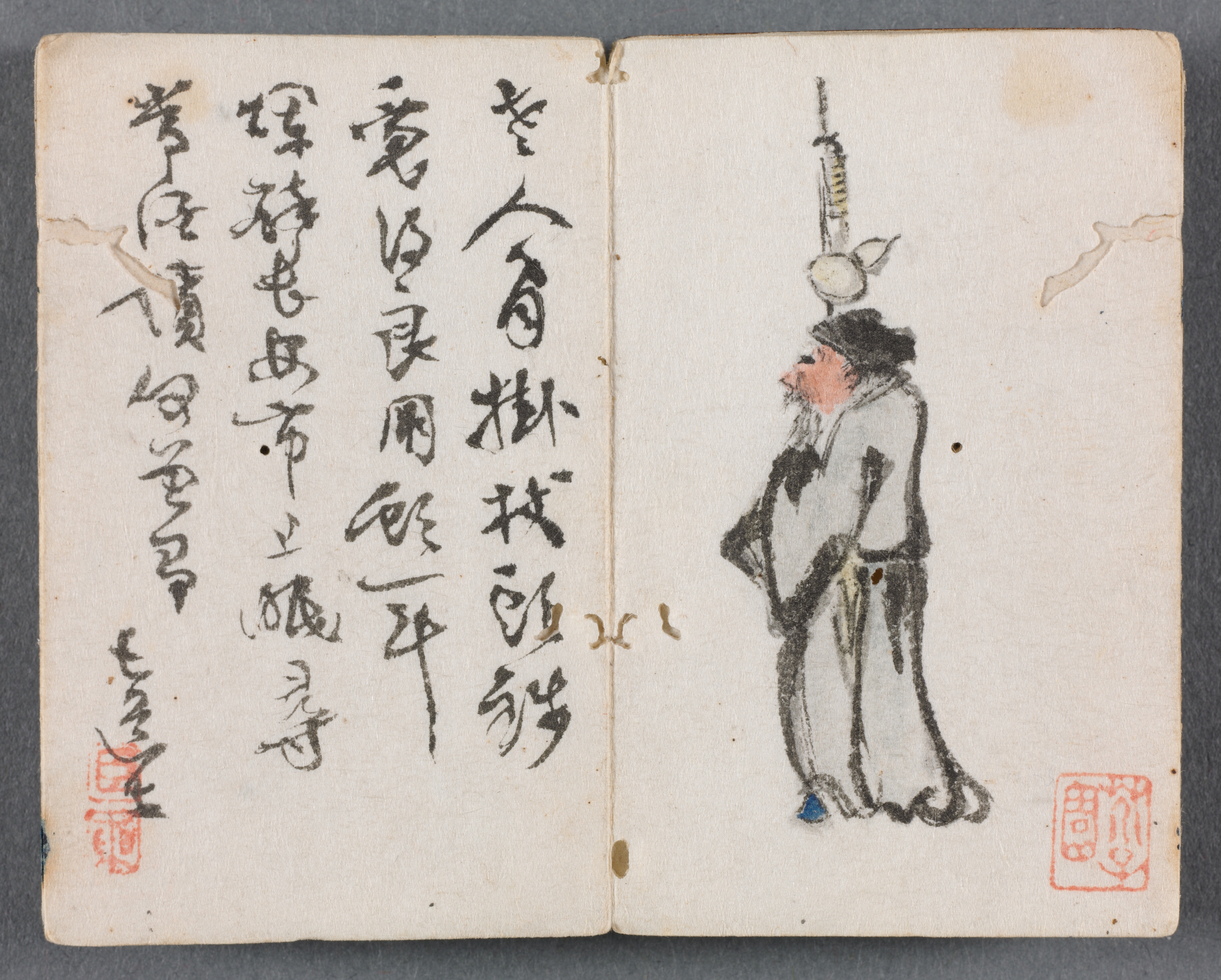 Miniature album with a figure and a landscape; drawing of a man with a staff. The album is small. The cover is not visible; only the interior pages are shown. The left page has black Chinese calligraphy writing. There is a red stamp in the bottom-left corner of the left page. The right page depicts a standing male figure in a white robe, with a black hat and a staff. He faces left. He has a white beard. There is a red stamp in the bottom-right corner. The background appears to be gray.