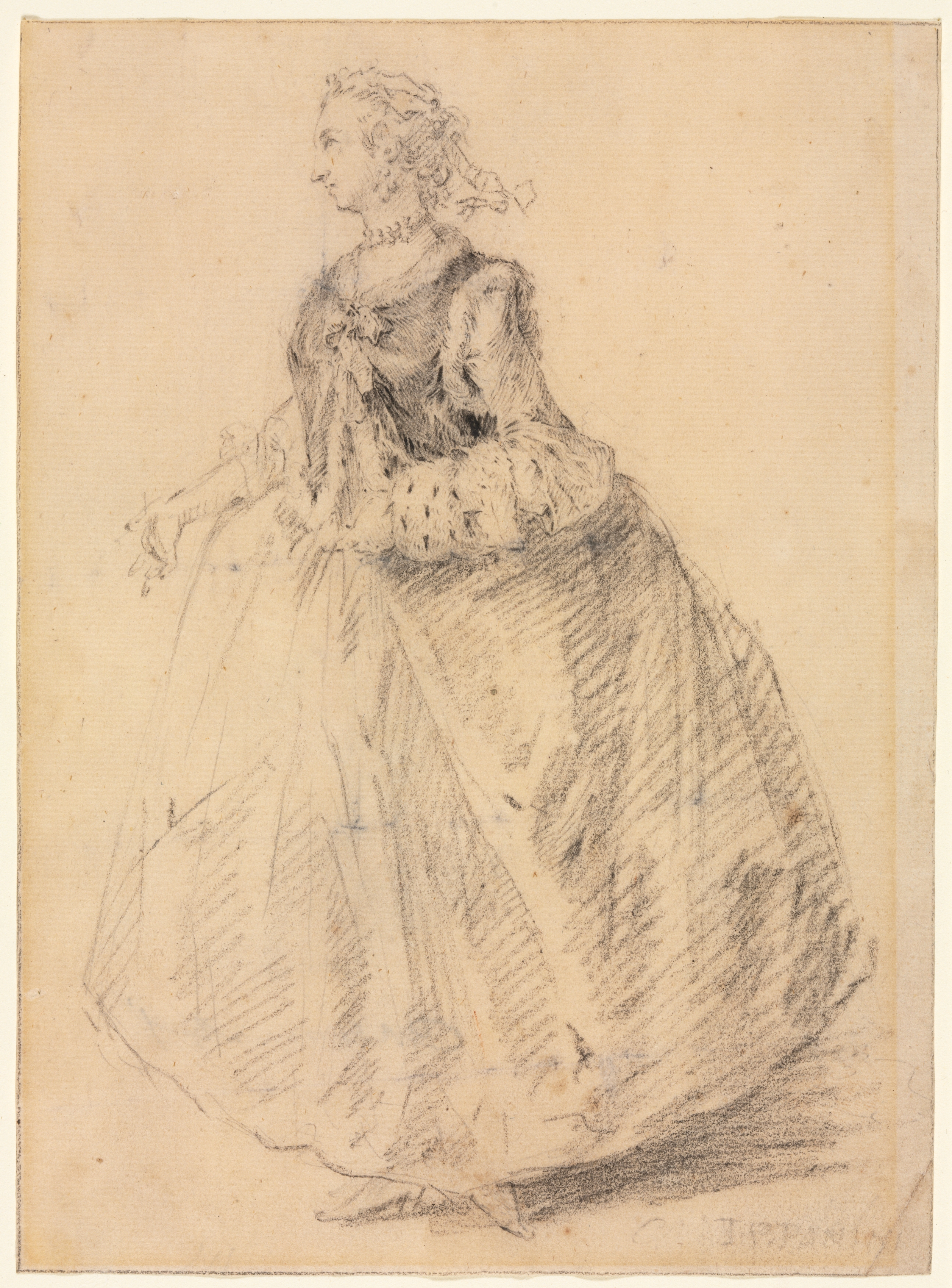 The drawing depicts a woman standing, turned to the left. Her curly hair is pulled back. She wears a dress with a fitted, long-sleeved top adorned with lace and a full skirt. A muff made of ermine fur is held in her right hand, positioned in front of her waist. The drawing is rendered in pencil on aged paper with a light brown hue. The woman's facial features are minimal, with only a suggestion of her expression. The overall style of the drawing is simple and elegant.