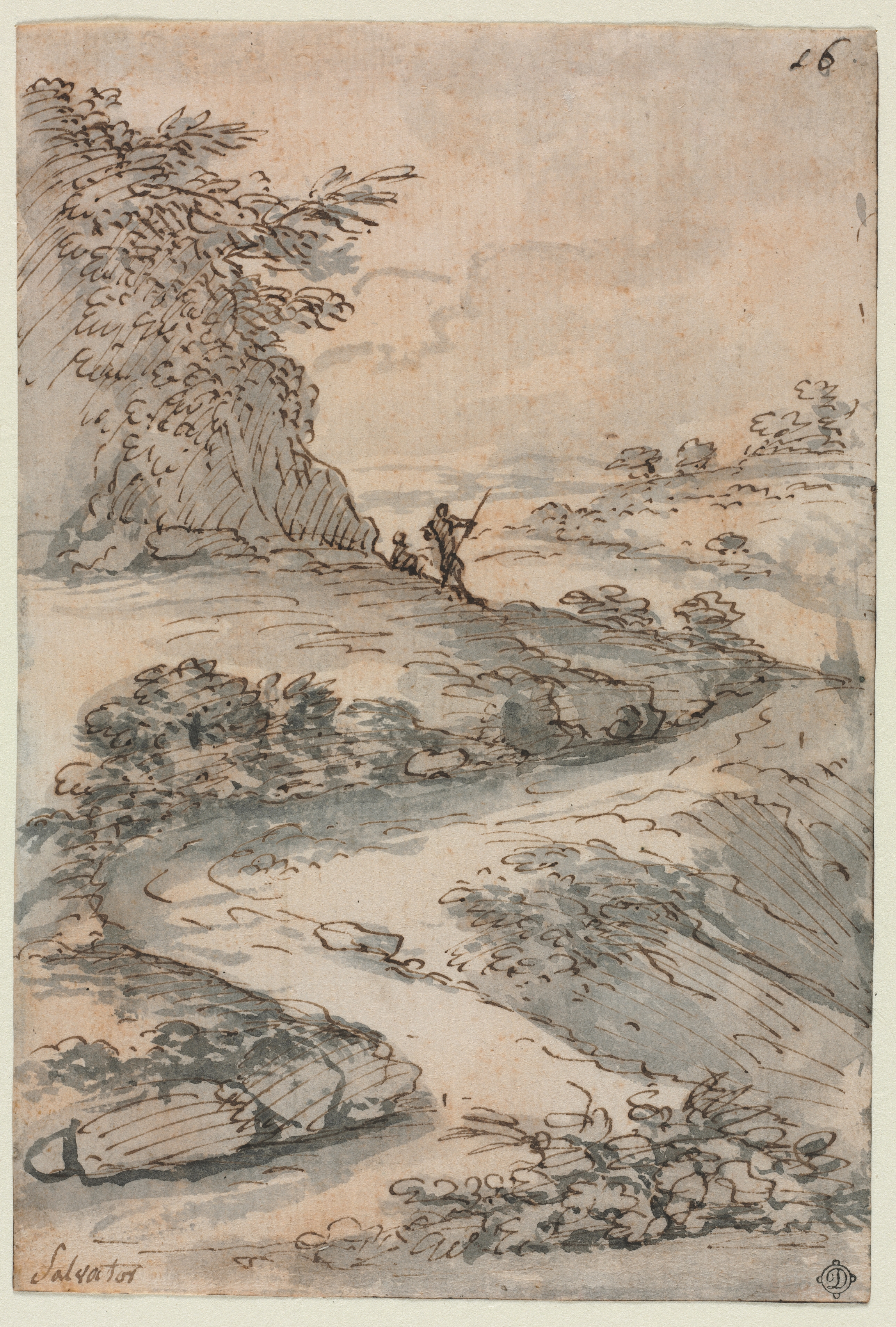 Brown and gray drawing on beige paper of a winding road with shrubs and trees on both sides. Two people walk on the road in the background. A large bush or tree on the left side. A body of water and distant land on the horizon. Sky above has some darker clouds on the right. Signature in brown ink on the bottom left. Small monogram in bottom right corner. A number "16" in the top right corner.