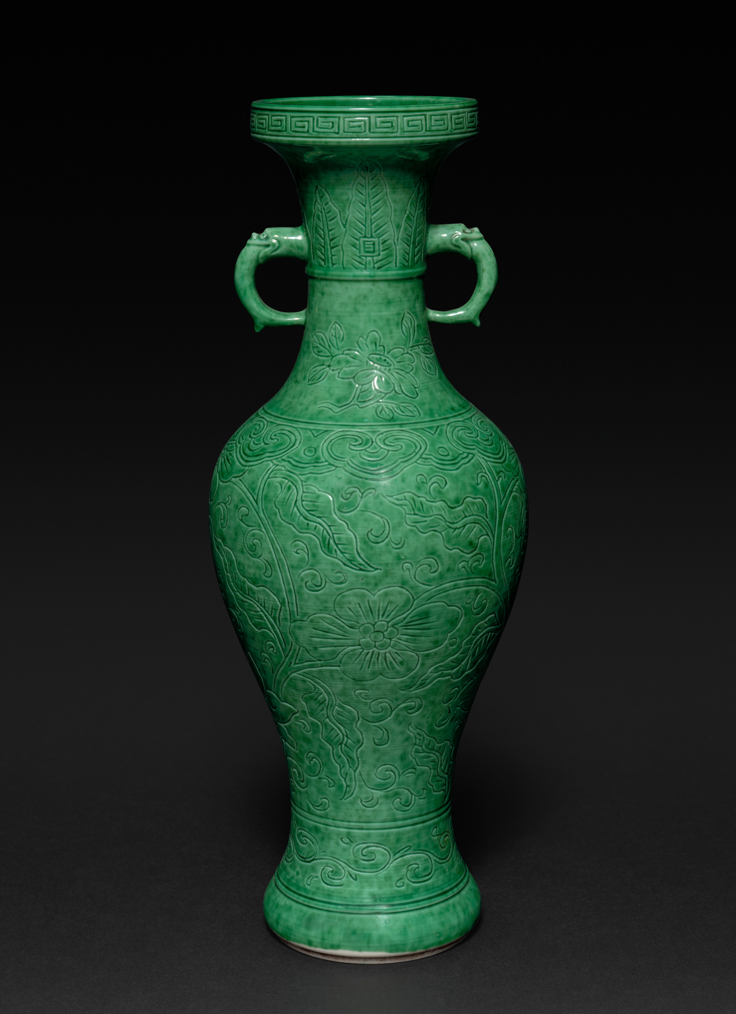 Green vase, two handled vase, ceramic vase, bulbous body, narrow neck, wide mouth, ornate design, floral pattern, geometric pattern on rim.