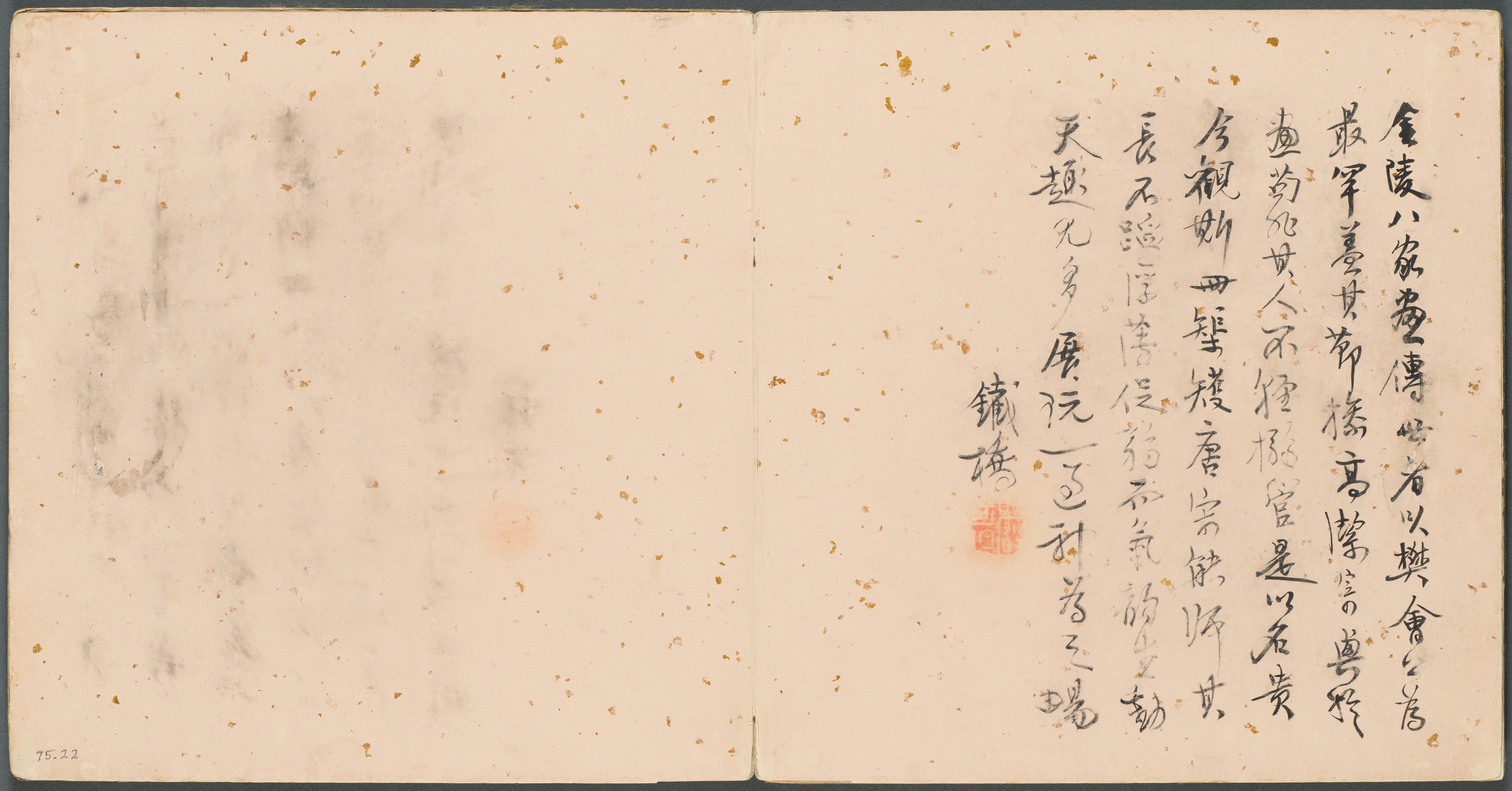 Album of Miscellaneous Subjects, Colophon by Fan Qi. The image shows an open book with yellowed pages. The left page is blank, except for some dark smudges and brown spots. The right page contains black Chinese calligraphy written vertically. There is a red seal or stamp below the text. The pages have a worn, aged appearance with scattered brown spots and darker patches. The book's background is dark gray.